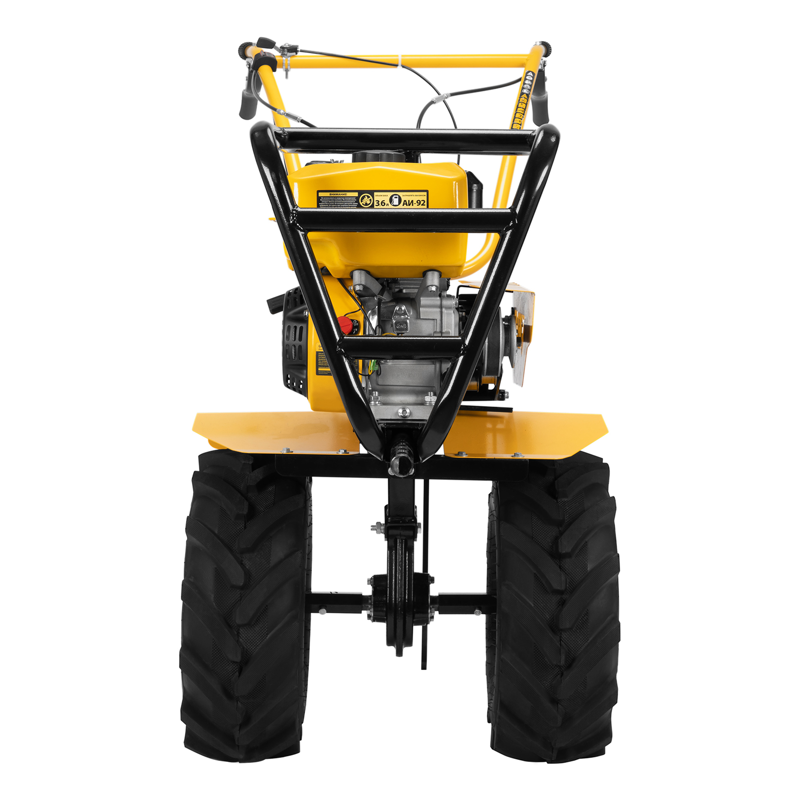 - Повышенная проходимость — мотоблок оснащен тракторными пневматическими колесами.