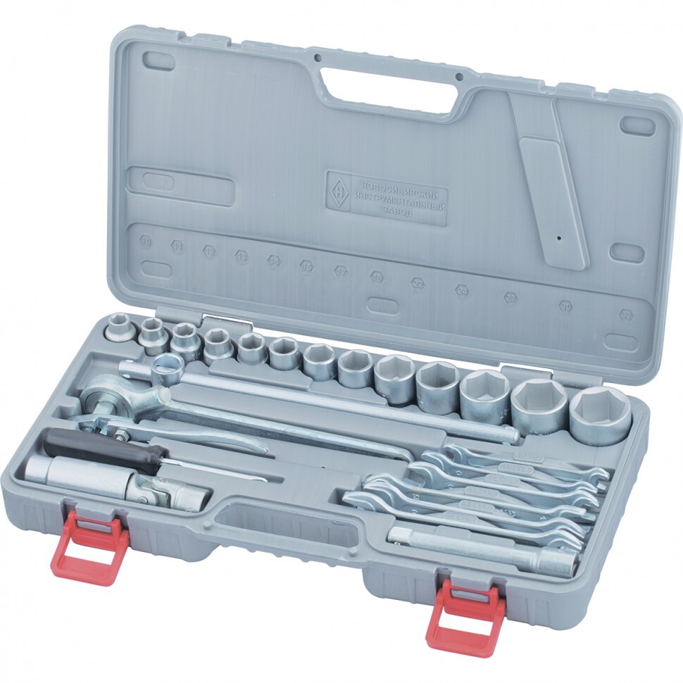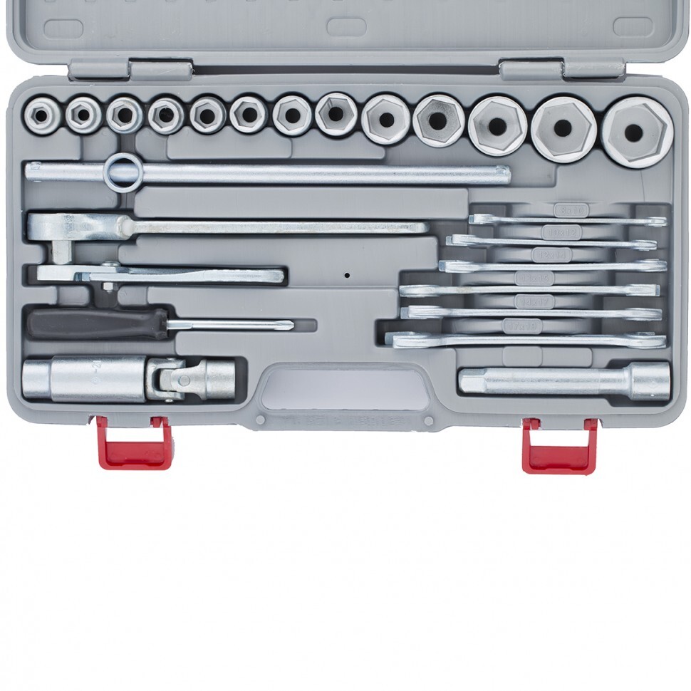 Головки 10, 11, 12, 13, 14, 15, 17, 19, 22, 24, 27, 30, 32 - 13 штКлючи 8х10, 10х12, 12х14, 13х15, 14х17, 17х19 - 6 штКлюч трещотка - 1 штВороток Т-образный - 1 штУдлинитель - 1 штШарнир - 1 штГоловка свечная - 1 штПлоскогубцы - 1 штОтвертка - 1 штКейс - 1 штПлоскогубцы - 1 штТрещотка - 1 шт