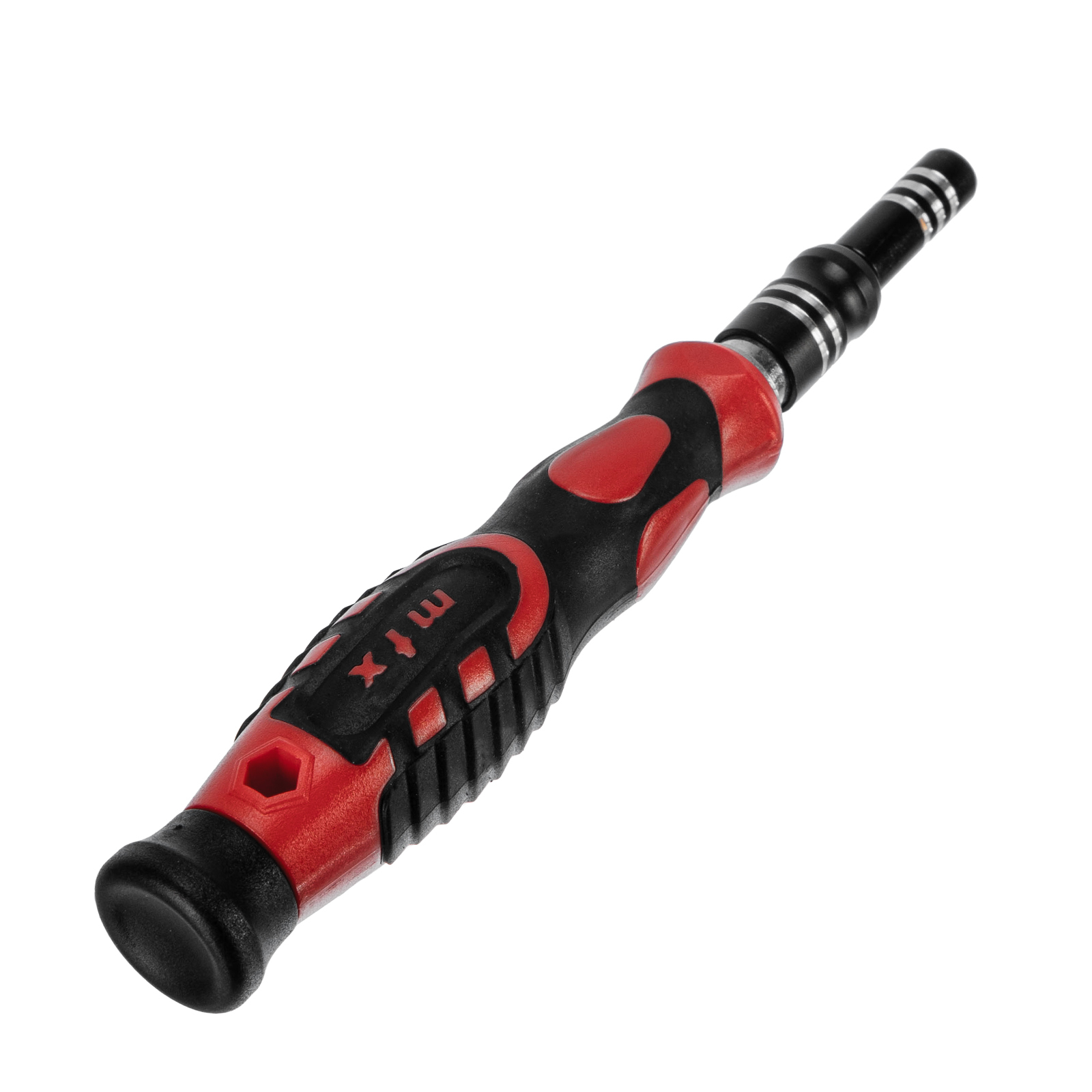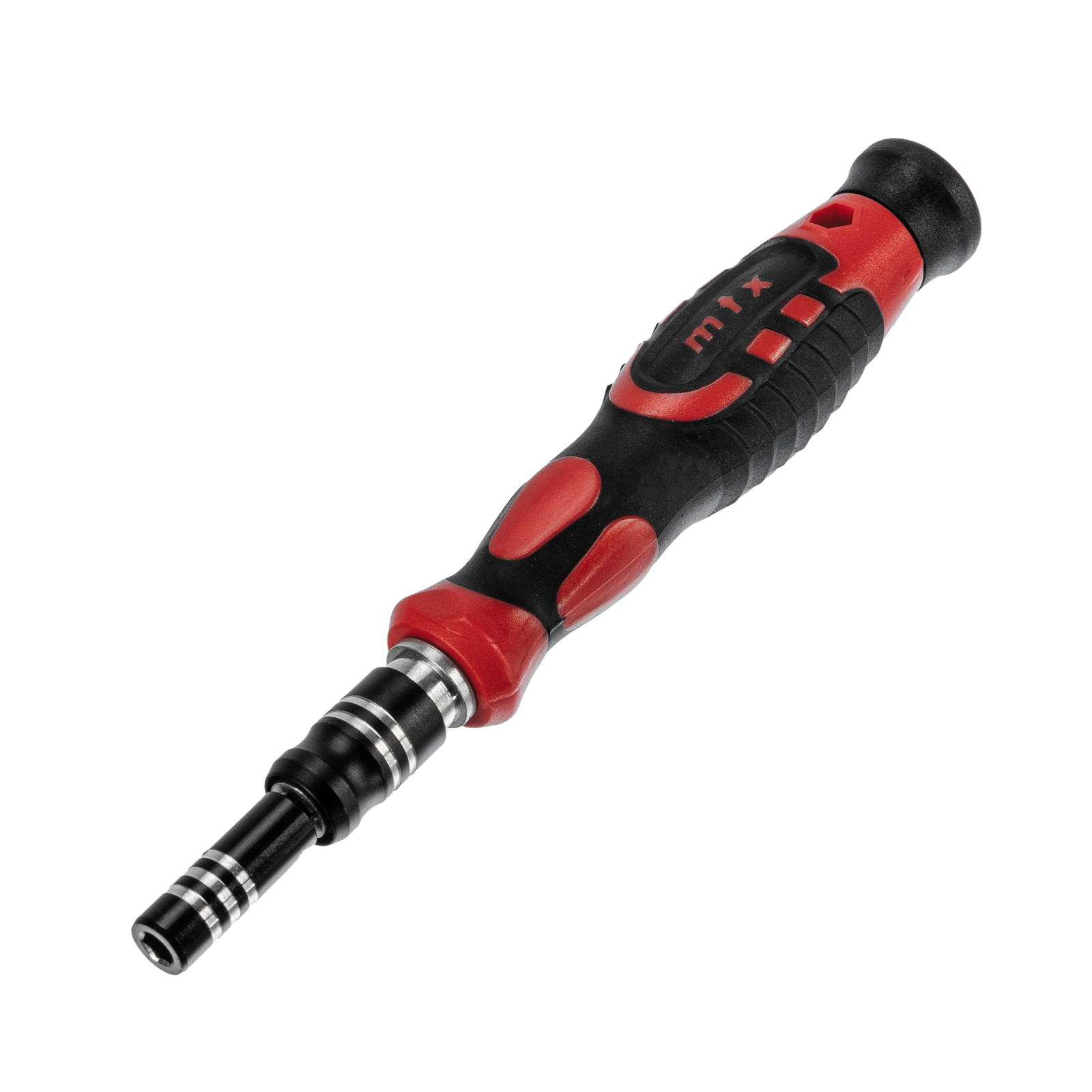Набор для точных работ MTX 135697 включает в себя 93 биты, 9 торцевых головок, телескопический и гибкий удлинители, намагничиватель-размагничиватель бит, отвертку и пинцет с защитным колпачком. С его помощью можно отремонтировать очки, игрушки, портативную и бытовую технику и т.д. Выдвижной стержень, гибкий удлинитель и пинцет позволяют работать с мелкими деталями в углублениях и труднодоступных местах.