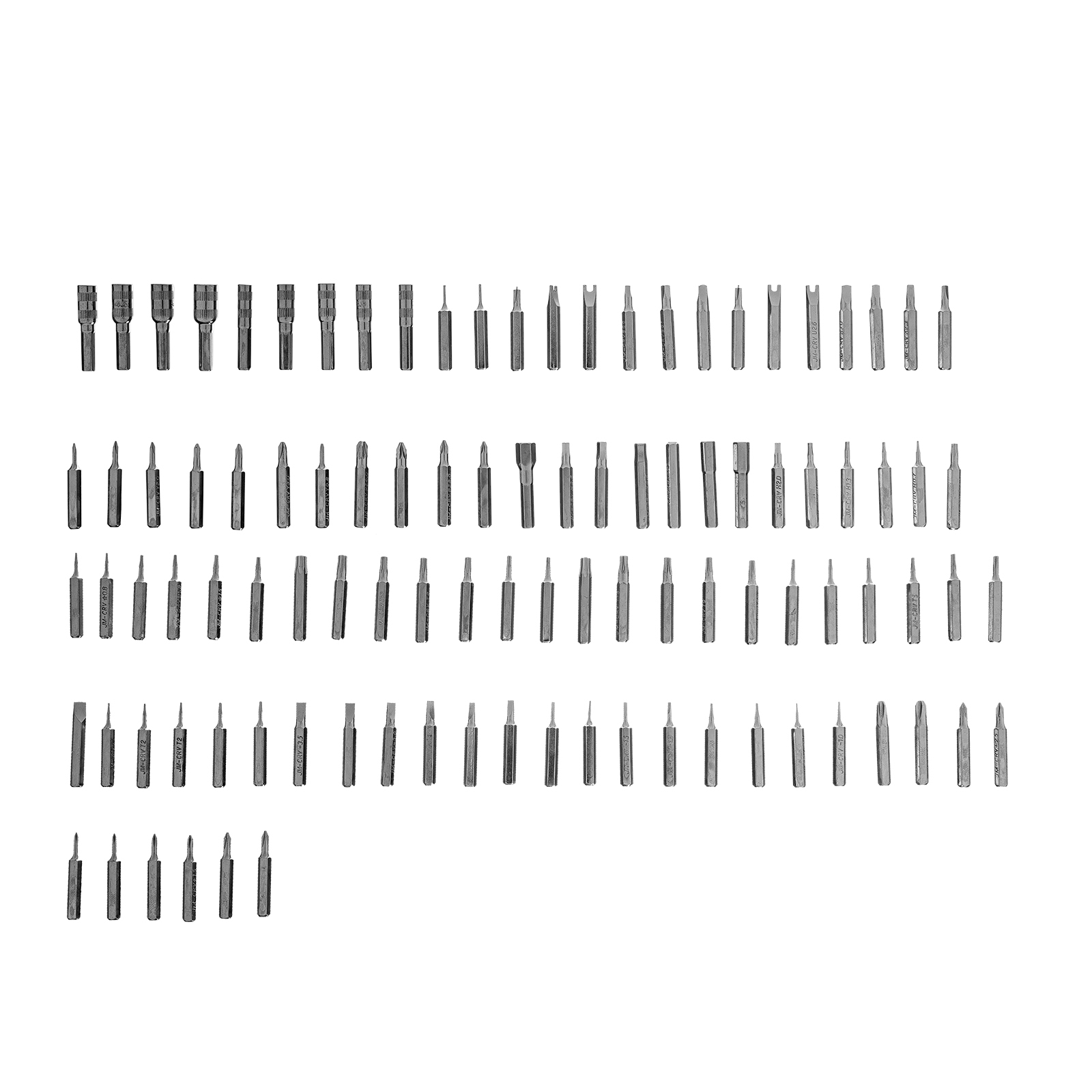 Биты для точных работ: H (0.7, 0.9, 1,3, 1.5, 2, 2.5, 3, 4, 4.5, 5, 6), T (1, 2, 3, 4, 5, 6, 7, 8, 9, 10, 15, 20), TT (6, 7, 8, 9, 10, 15, 20), PH (1, 1.5, 2, 2.5, 4), PZ (1, 2, 3, 4), SL (1, 1.3, 1.5, 2, 2.5, 3, 3.5, 4), Str (0.8, 1.2, 1.5, 2), Y (0.8, 2, 2.5, 3), STANDOFF (1.5), TA (2, 2.3, 2.6, 3), U (2.6, 3), SQ (0, 1, 2), SIM (0.8, 1) - 93 штТорцевые головки: H (2.5, 3, 3.5, 4, 4.5, 5, 5.5), TT (3.8, 4.5) - 9 штТелескопический удлинитель - 1 штГибкий удлинитель - 1 штНамагничиватель-размагничиватель - 1 штОтвертка - 1 штПинцет с защитным колпачком - 1 штПластиковый кейс - 1 шт