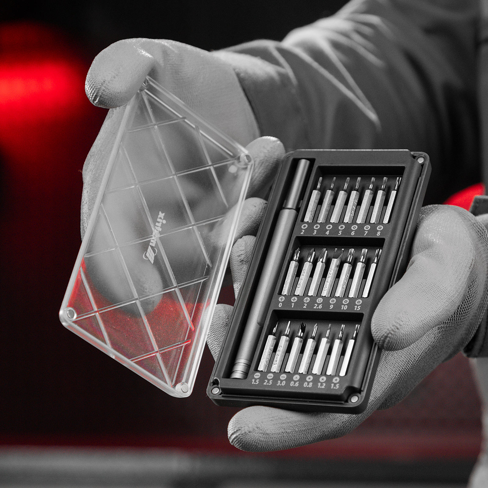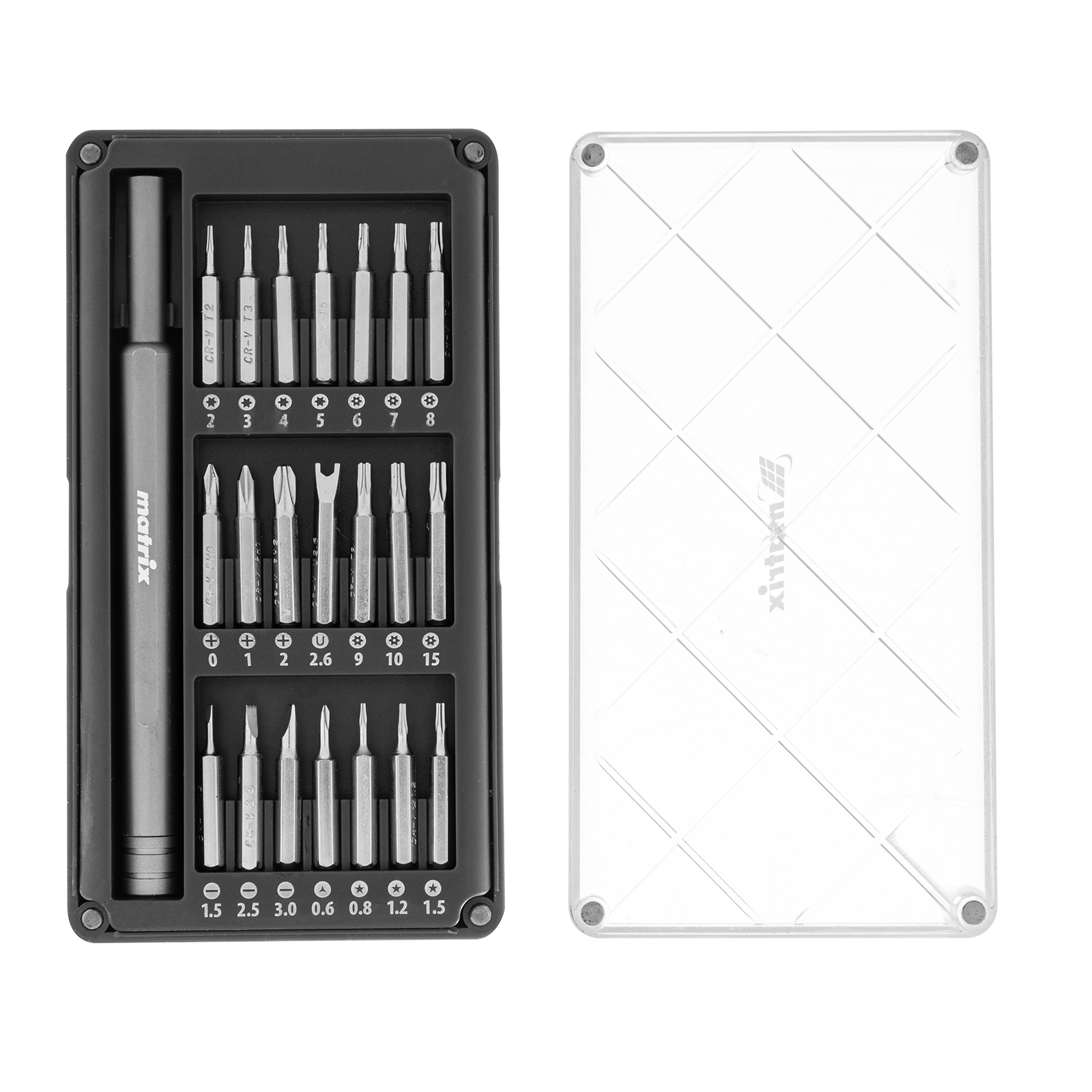 Биты для точных работ: T (2, 3, 4, 5), PH (0, 1, 2), SL(1.5, 2.5, 3.0), Str (0.8, 1.2, 1.5),Y(0.6), TT(6, 7, 8, 9, 10, 15), U (2.6) - 21 штОтвертка - 1 штПластиковый кейс - 1 шт