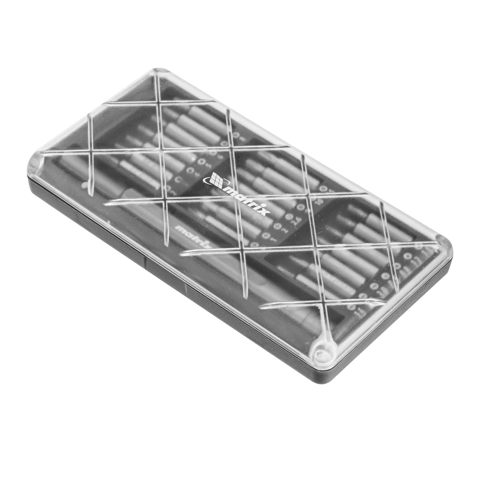 Универсальный набор для точных работ Matrix 13566 22 в 1 содержит 21 биту под шлицы PH, SL,T, H, Str, Y и U, а также отвертку-держатель. Вращающийся затыльник позволяет поворачивать отвертку перебором пальцев, что упрощает работу с мелким крепежом. При помощи входящих в набор инструментов можно отремонтировать очки, игрушки, портативную и бытовую технику и т.д.