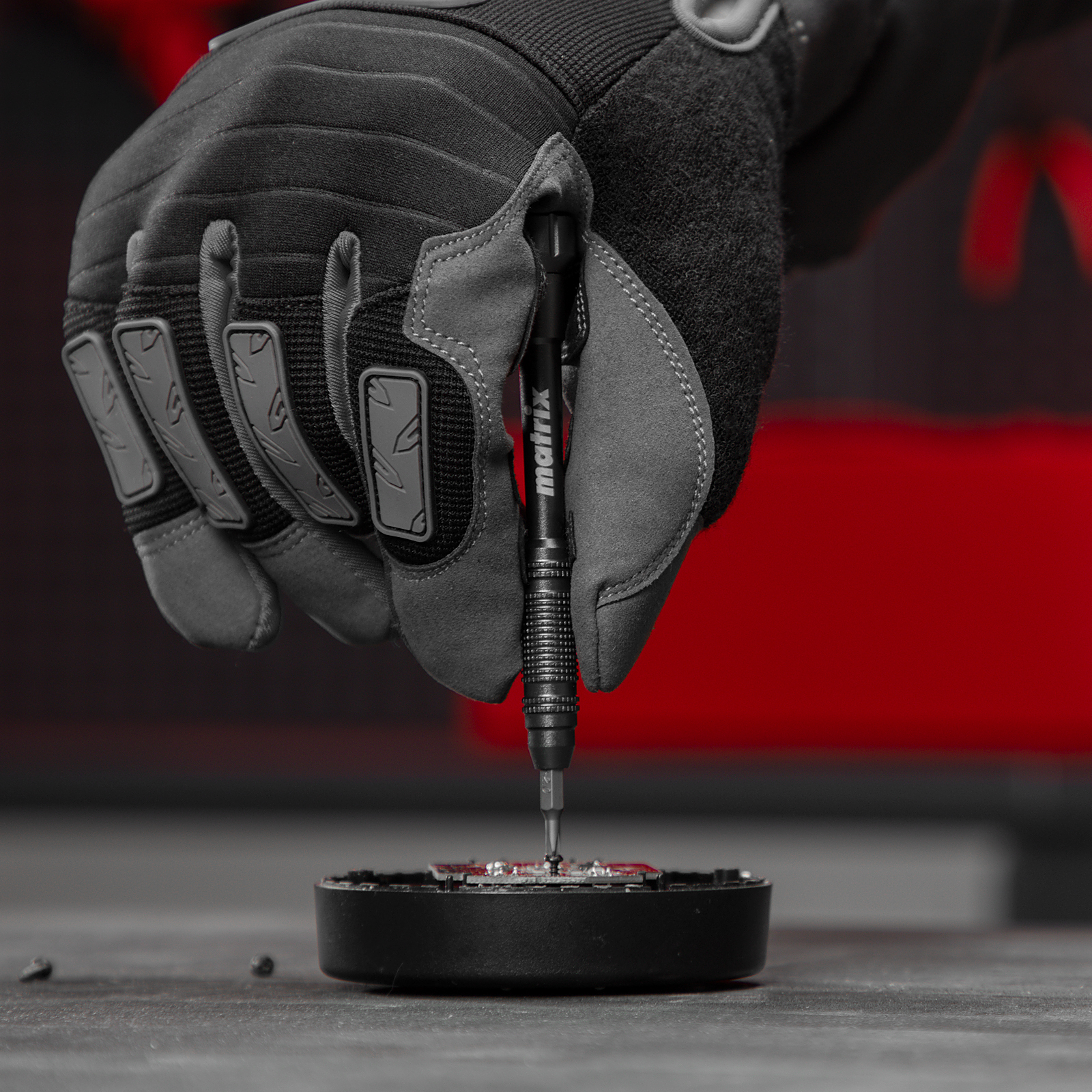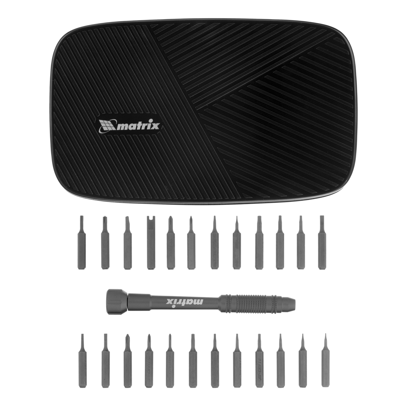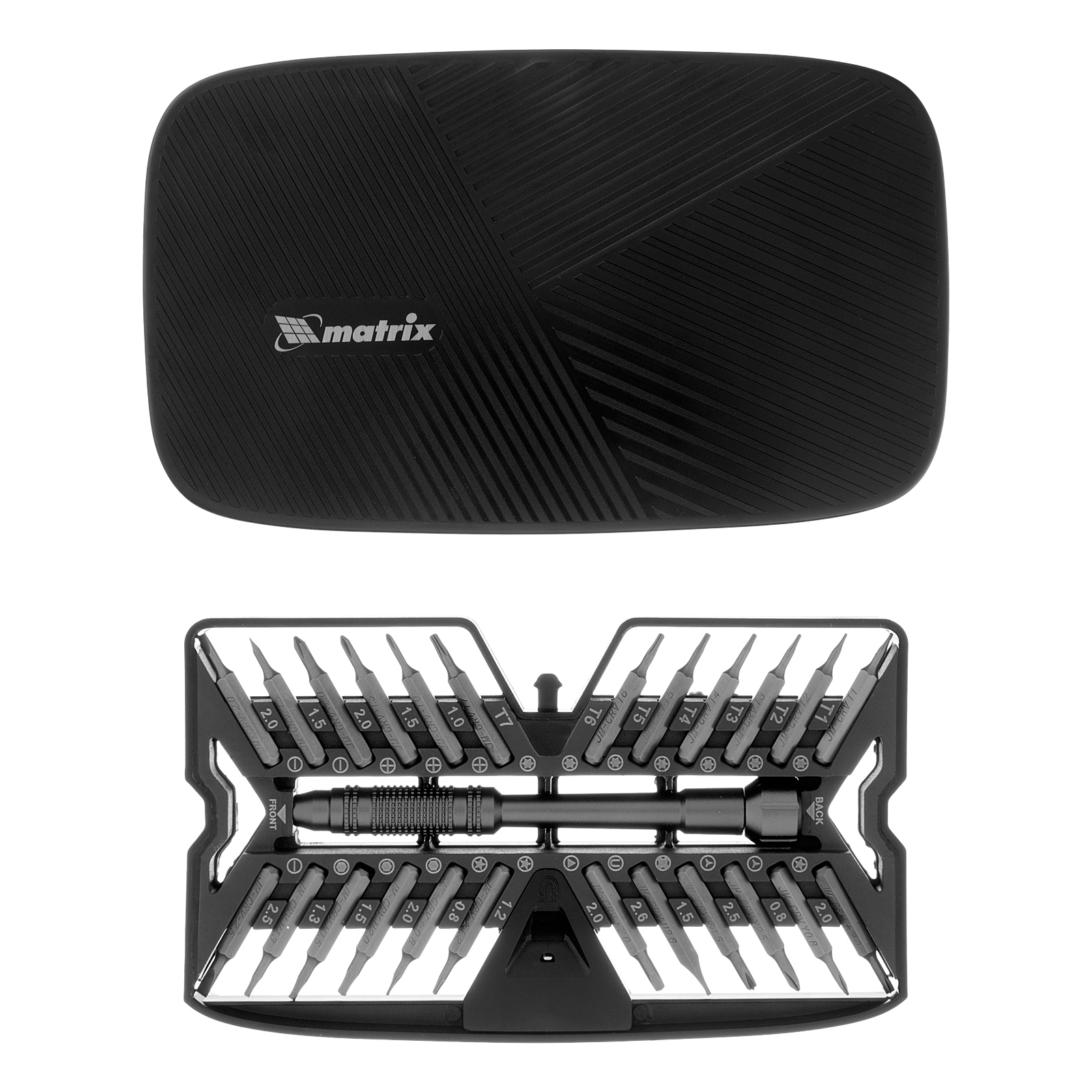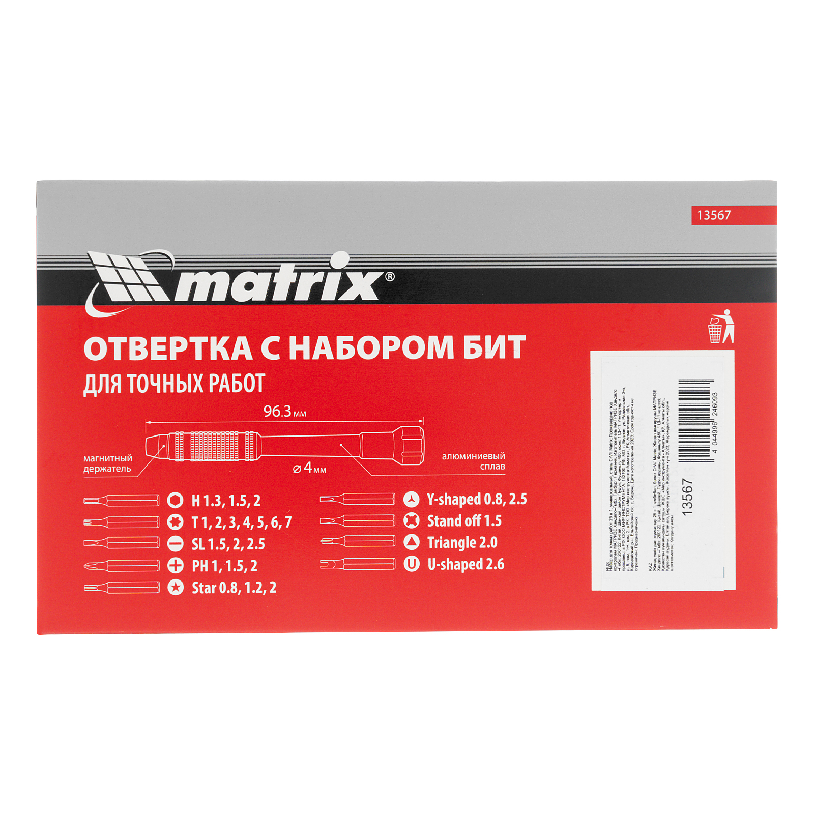 <p>Набор для точных работ 26 в 1 Matrix 13567 содержит 24 биты с наконечниками PH, SL,T, H, Str, Y, St, TR, U, отвертку и пластиковый кейс. С его помощью можно отремонтировать очки, игрушки, портативную и бытовую технику и т.д.</p><h2>Преимущества</h2><ul><li>Прочность и долговечность — насадки изготовлены из стали CrV и закалены до твердости 52 HRC.</li><li>Удобная эксплуатация — вращающийся затыльник позволяет поворачивать отвертку перебором пальцев.</li><li>Намагниченные биты — металлический крепеж легко доставать из углублений и направлять одной рукой.</li><li>Комфортная работа — легкая эргономичная рукоятка из алюминия удобно ложится в руку.</li><li>Продуманное хранение и транспортировка — набор упакован в жесткий пластиковый кейс.</li></ul>