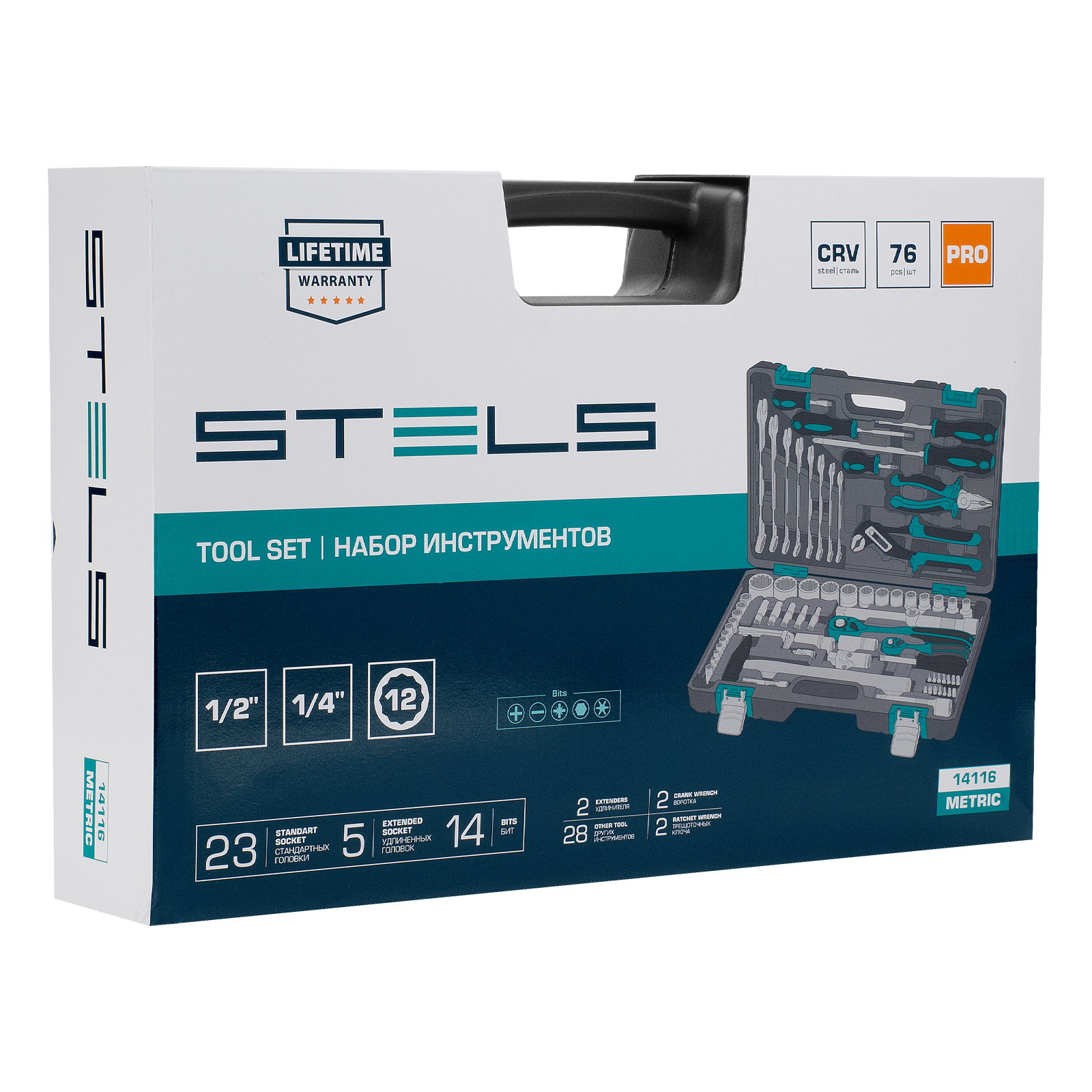 Набор инструментов, 1/2", 1/4", CrV, 12 гранные головки, пластиковый кейс, 76 предметов Stels