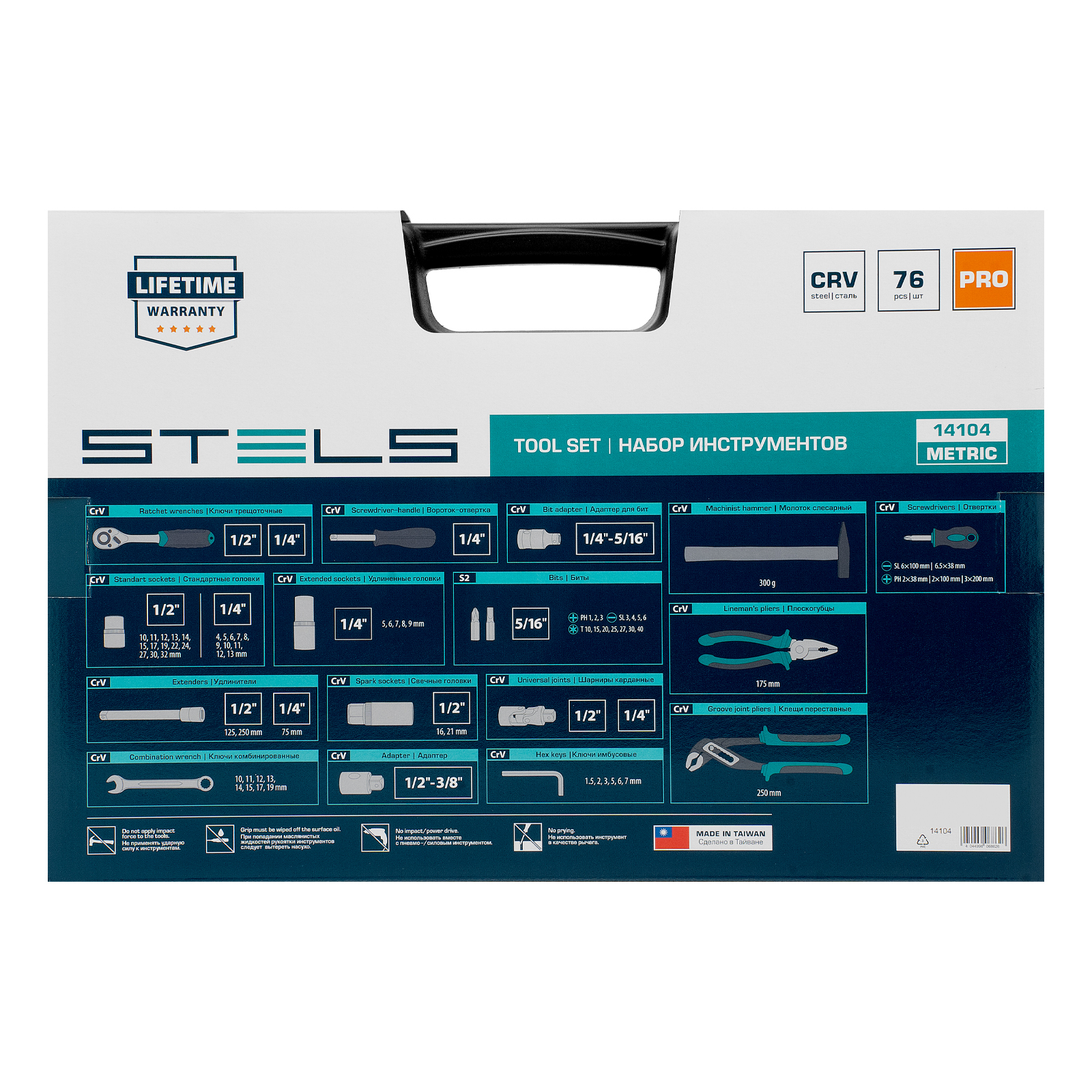 Набор инструментов Stels 14104 в ударопрочным пластиковом кейсе состоит из 76 предметов с присоединительными квадратами 1/2″ и 1/4″, из стали CrV и S2, и предназначен для выполнения слесарно-монтажных работ. Включает инструменты и насадки для работы с резьбовыми крепежами, а также удлинители и т-образный вороток, облегчающие работу в труднодоступных местах. Молоток, плоскогубцы и переставные клещи расширяют возможности применения набора. Набор предназначен для профессионального использования в автомастерской, будет полезен и для решения бытовых задач.