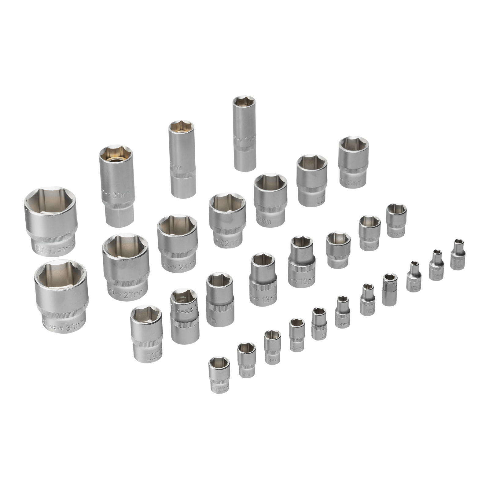 Ключ-трещотка 1/2", 1/4" - 2 штВороток шарнирный 1/2": 380мм - 1 штУдлинитель 1/2": 125 мм - 1 штУдлинители 1/4": 50, 100 мм - 2 штКардан 1/2", 1/4" - 2 штПереходник для бит 1/4" - 1 штБокорезы: 150 мм - 1 штПлоскогубцы: 175 мм - 1 штМолоток 2К-рукоятка: 300г - 1 штНожовка по металлу: 150 мм - 1 штНож универсальный: 18 мм - 1 штРулетка: 3м - 1 штОтвертки с шестигранным сечением и выступом под ключ - 6 штГоловки торцевые 1/4" - 13 штГоловки торцевые 1/2" - 13 штКлючи комбинированные - 10 штГоловки свечные магнитные 1/2" - 3 штКлючи имбусовые - 9 штБиты-вставки 1/4", 25 мм - 30 штПластиковый кейс - 1 шт