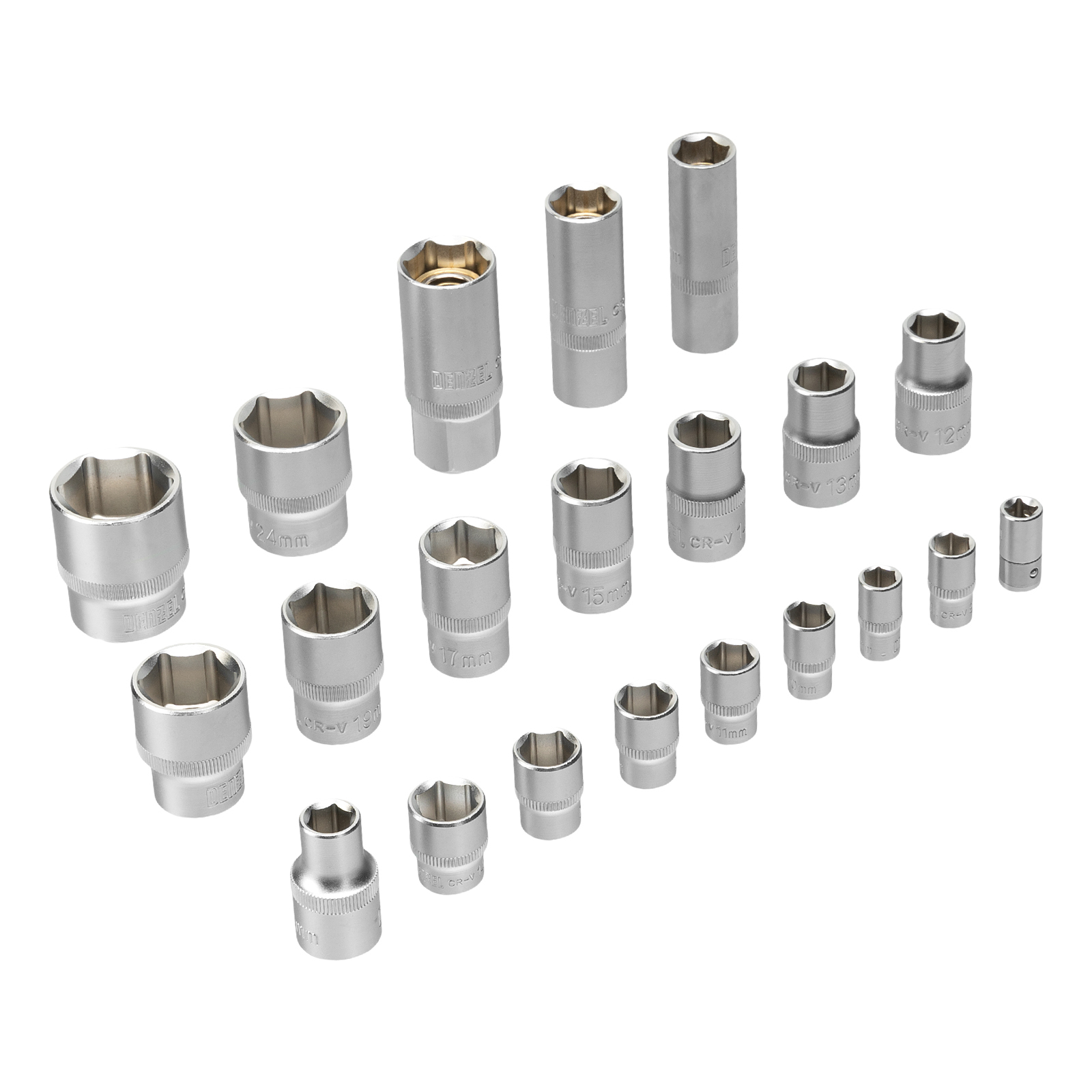 Набор инструментов Denzel 15801 состоит из 64 предметов с присоединительными квадратами 1/4″ и 1/2″, упакованных во вместительный ударопрочный кейс собственной разработки с антивандальным покрытием. В комплект поставки входят инструменты и оснастка для монтажа и демонтажа резьбовых соединений, а также молоток, плоскогубцы, переставные клещи для выполнения слесарных и сантехнических работ и рулетка для проведения измерений. Набор предназначен для профессионального использования в автомастерской, будет полезен и для решения бытовых вопросов.