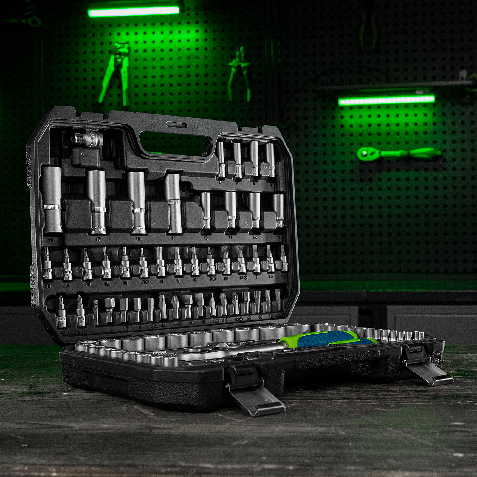 Набор инструментов Сибртех 13388 упакован в пластиковый кейс и состоит из 94 предметов с присоединительным размером 1/2" и 1/4", предназначенных для монтажа и демонтажа резьбового крепежа с разными типами шлицев. В комплект поставки входят карданы, удлинители и переходники, облегчающие работу в труднодоступных местах. Набор используется для ремонта автомобилей, а также полезен в быту.