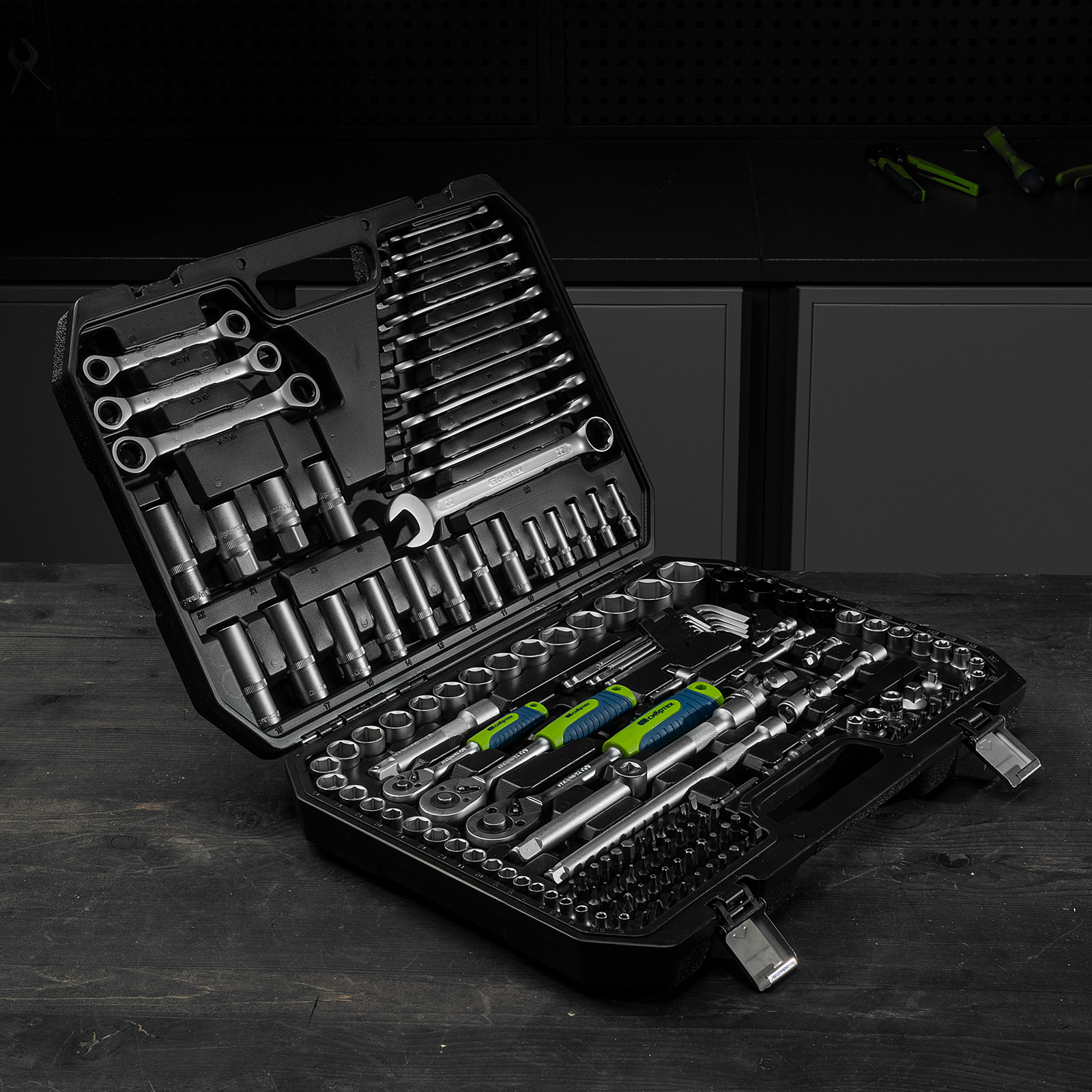 Набор инструментов Сибртех 14172 упакован в пластиковый кейс и состоит из 160 предметов с присоединительным размером 1/2", 3/8", 1/4", предназначенных для монтажа и демонтажа резьбового крепежа с разными типами шлицев. В комплект поставки входят карданы, удлинители и переходники, облегчающие работу в труднодоступных местах. Набор используется для ремонта автомобилей, а также будет полезен в быту.