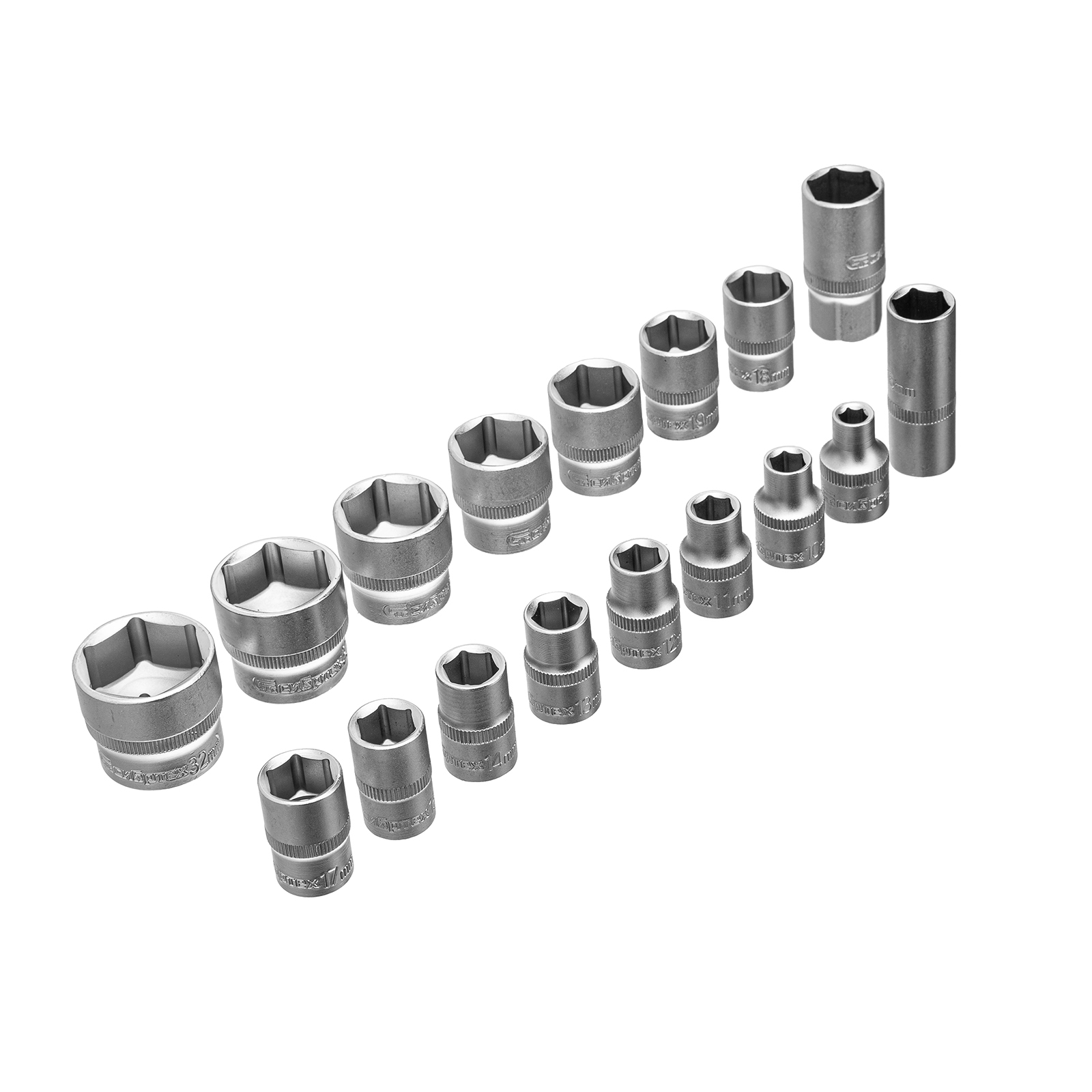 - Прочная фиксация — шариковый замок на трещотках, воротках, шарнирах и удлинителях надежно удерживает головки.