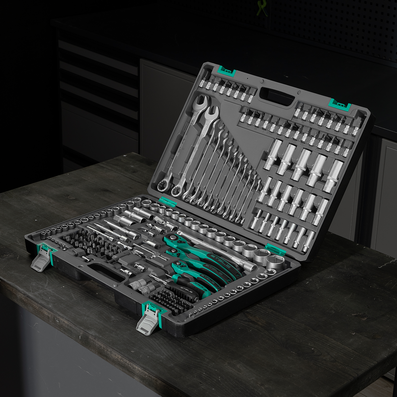 Набор инструментов Stels 14115 в ударопрочным пластиковом кейсе состоит из 216 предметов с присоединительными квадратами 1/4″, 3/8″ и 1/2″, из стали CrV и S2, и предназначен для выполнения слесарно-монтажных работ. Включает инструменты и насадки для работы с резьбовыми крепежами, а также удлинители (в том числе гибкий), т-образный вороток и карданные шарниры, облегчающие работу в труднодоступных местах. Набор предназначен для профессионального использования в автомастерской, будет полезен и для решения бытовых задач.