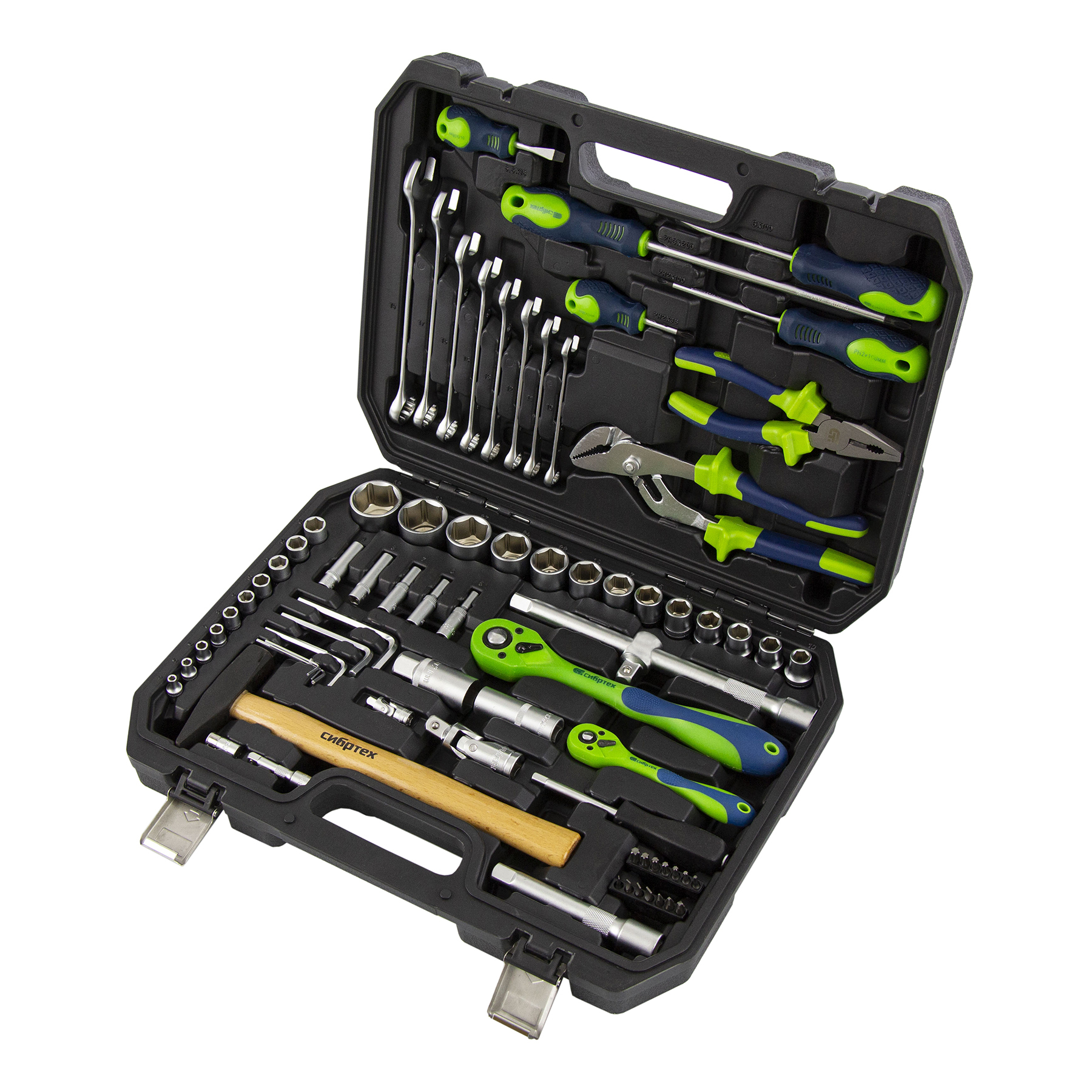 Набор инструментов Сибртех 13528 упакован в пластиковый кейс и состоит из 76 предметов из стали CrV, с присоединительными размерами 1/2" и 1/4". Предназначен для монтажа и демонтажа резьбового крепежа с разными типами шлицев, а также для проведения ударных и других слесарно-монтажных работ. В комплект поставки входят карданы, удлинители и переходники, облегчающие работу в труднодоступных местах. Набор используется для ремонта автомобилей, а также полезен в быту.