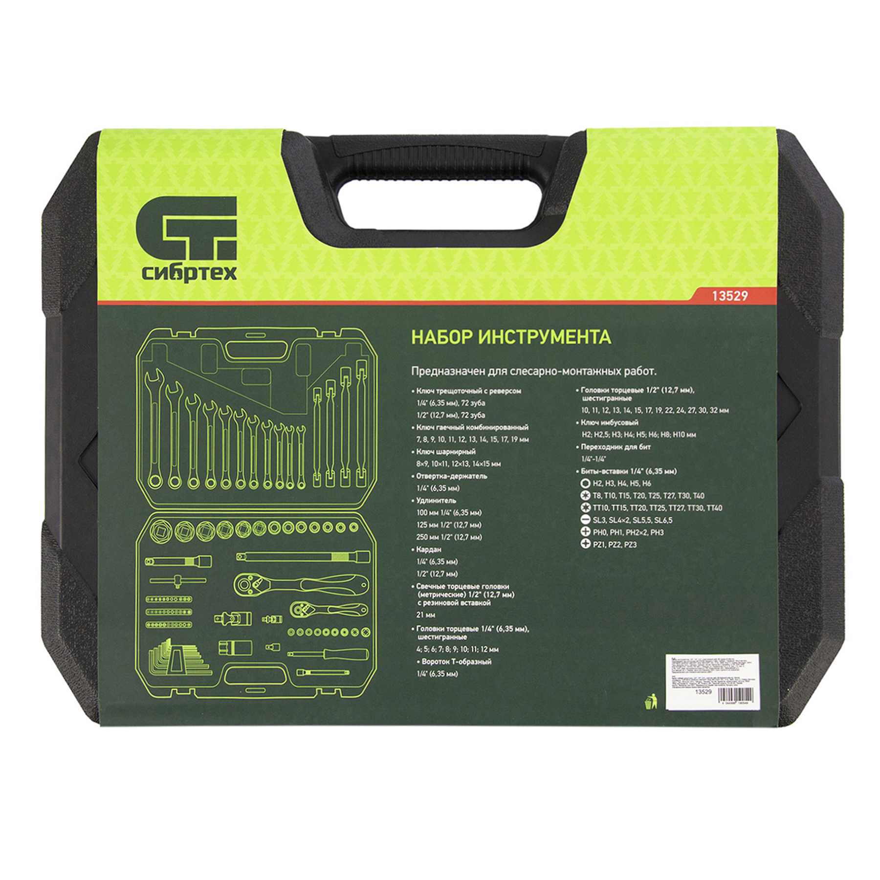 Набор инструментов Сибртех 13529 упакован в пластиковый кейс и состоит из 89 предметов из стали CrV, с присоединительными размерами 1/2" и 1/4". Предназначен для монтажа и демонтажа резьбового крепежа с разными типами шлицев. В комплект поставки входят карданы, удлинители и шарнирные ключи, облегчающие работу в труднодоступных местах. Набор используется для ремонта автомобилей, а также полезен в быту.