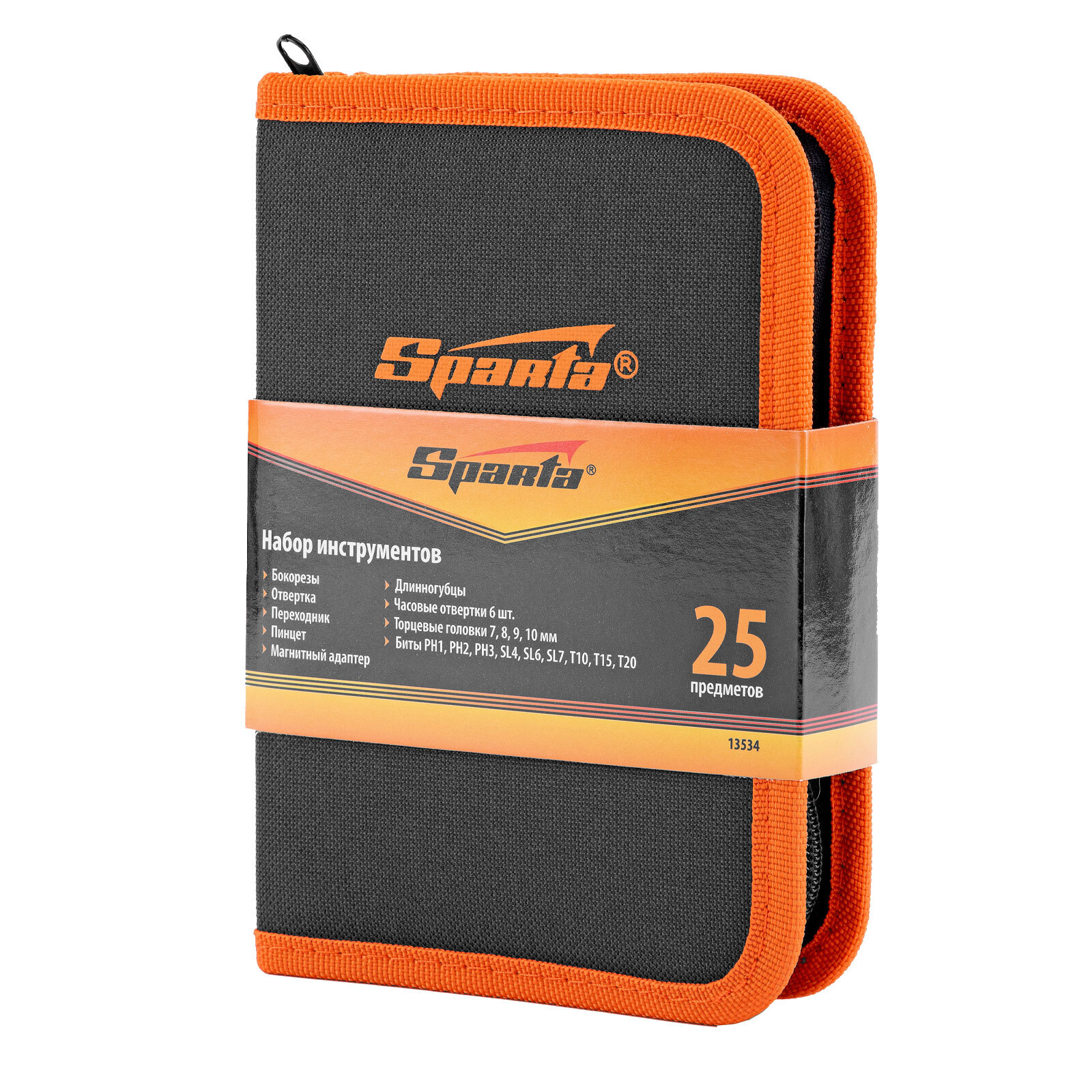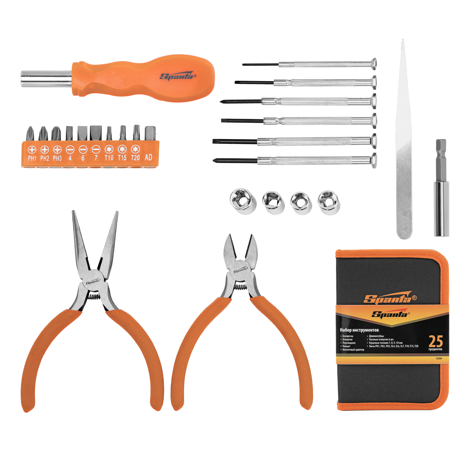 <p>Набор Sparta 13534 включает 25 предметов, необходимых при проведении слесарно-монтажных работ. Он рассчитан на бытовое использование, поэтому будет полезен в хозяйстве. С помощью часовых отверток можно провести точные работы, биты и торцевые головки позволяют осуществить монтаж/демонтаж резьбовых соединений, вспомогательный инструмент пригодится для захвата и удержания деталей, удлинитель используется для работы в труднодоступных местах.</p><h2>Преимущества</h2><ul><li>Комплектующие набора выполнены из инструментальной стали и закалены, что придает им необходимую прочность и твердость.</li><li>Отвертка, бокорезы и длинногубцы имеют пластиковые рукоятки для удобства захвата.</li><li>Компактный тканевый пенал на молнии обеспечивает удобство и безопасность транспортировки/хранения набора.</li></ul>