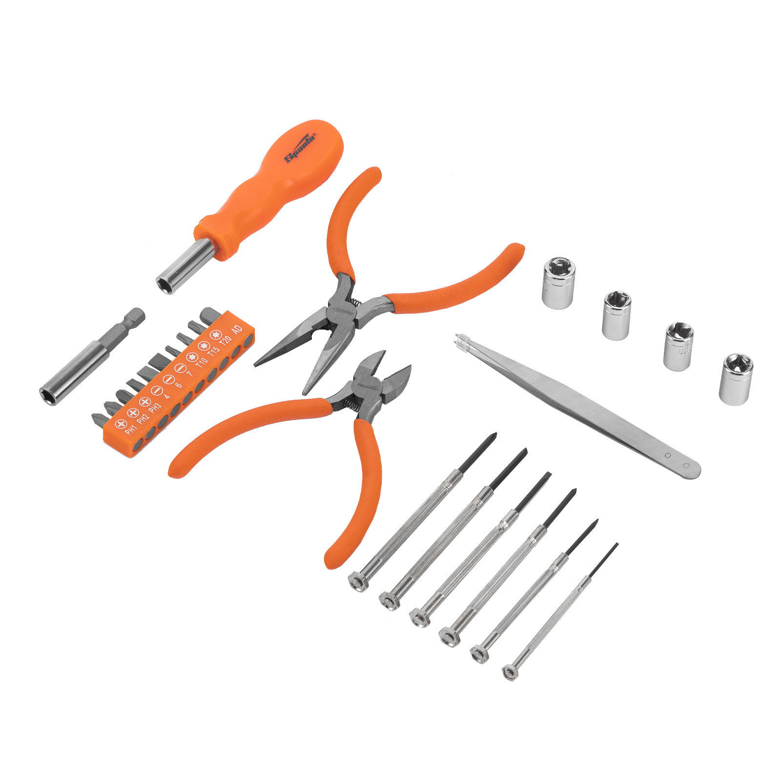 Набор Sparta 13534 включает 25 предметов, необходимых при проведении слесарно-монтажных работ. Он рассчитан на бытовое использование, поэтому будет полезен в хозяйстве. С помощью часовых отверток можно провести точные работы, биты и торцевые головки позволяют осуществить монтаж/демонтаж резьбовых соединений, вспомогательный инструмент пригодится для захвата и удержания деталей, удлинитель используется для работы в труднодоступных местах.