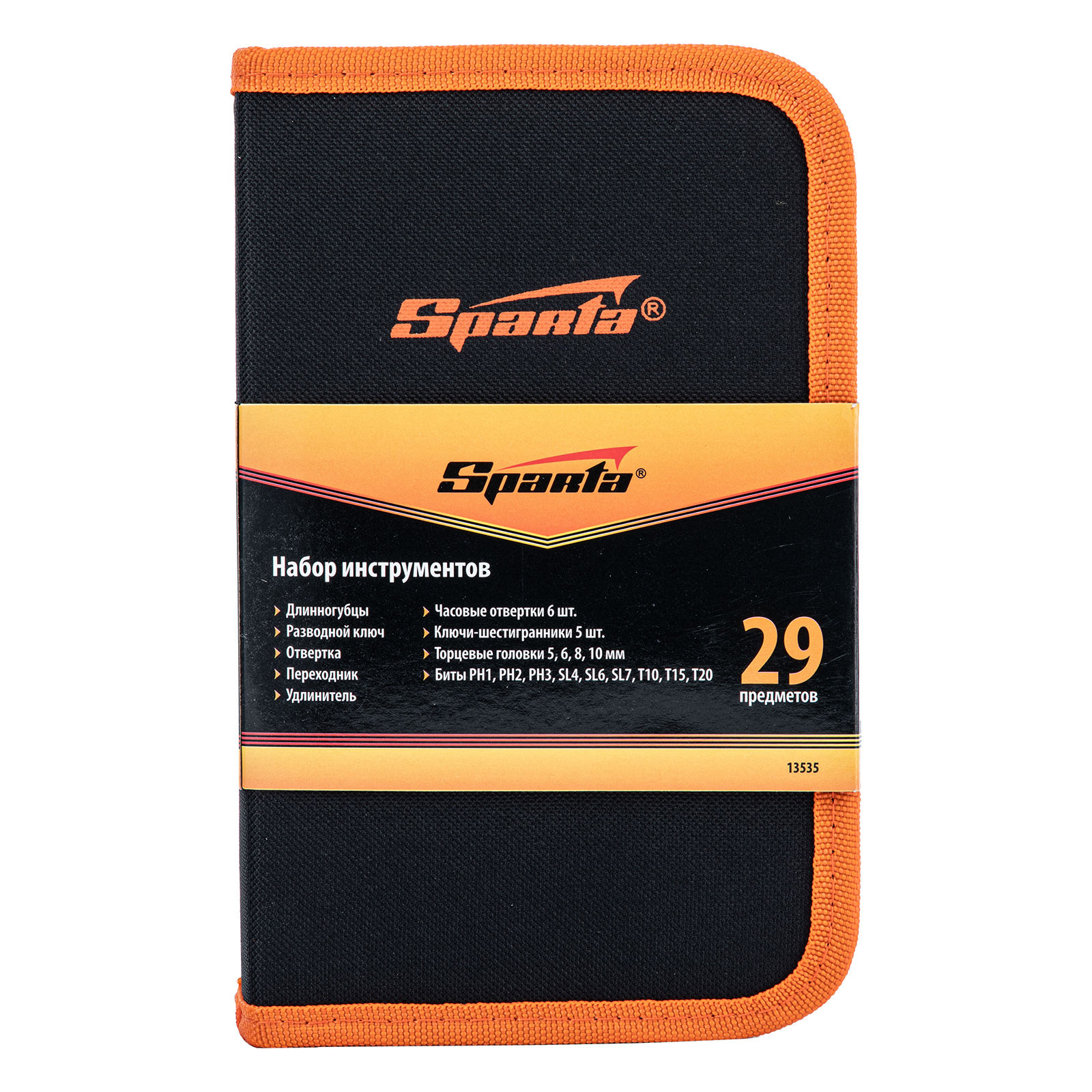 <p>Набор Sparta 13535 состоит из 29 предметов, предназначенных для проведения слесарно-монтажных работ. Подходит для применения в бытовых условиях, в гараже и небольшой мастерской. Входящие в набор биты и торцевые головки, ключи-шестигранники, часовые отвертки, длинногубцы, переходник, удлинитель и разводной ключ позволяют работать с крепежом, имеющим стандартную и мелкую резьбу, в том числе в труднодоступных местах.</p><h2>Преимущества</h2><ul><li>Комплектующие набора выполнены из инструментальной стали и закалены, что придает им необходимую прочность и твердость.</li><li>Отвертка и длинногубцы имеют пластиковые рукоятки для удобства захвата.</li><li>Компактный тканевый пенал на молнии обеспечивает удобство и безопасность транспортировки/хранения набора.</li></ul>