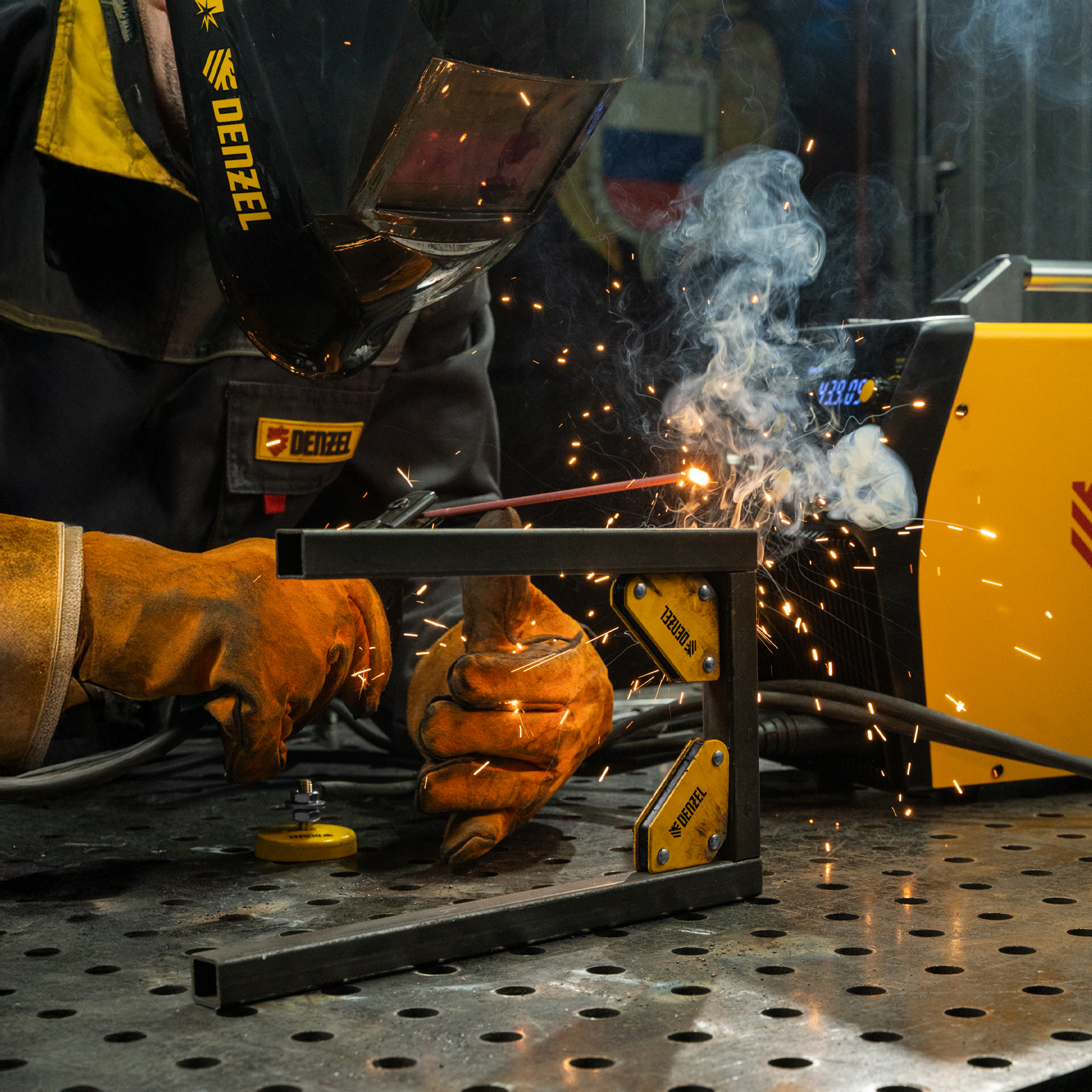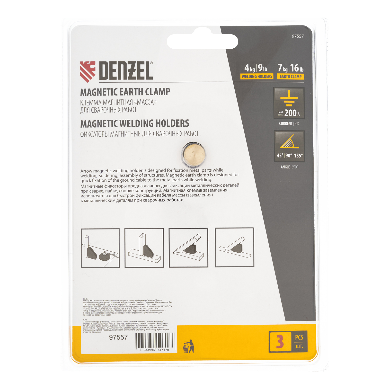 Набор из 2 магнитных фиксаторов и магнитной клеммы «масса» Denzel 97557 предназначен для проведения сварочных работ, пайки и монтажа металлоконструкций. Клемма с максимальным током 200 А обеспечивает электрическое соединение кабеля заземления и обрабатываемой детали, без которого невозможна ручная дуговая сварка. А магнитные уголки фиксируют свариваемые детали весом до 4 кг в нужном положении, благодаря чему мастер может работать в одиночку.