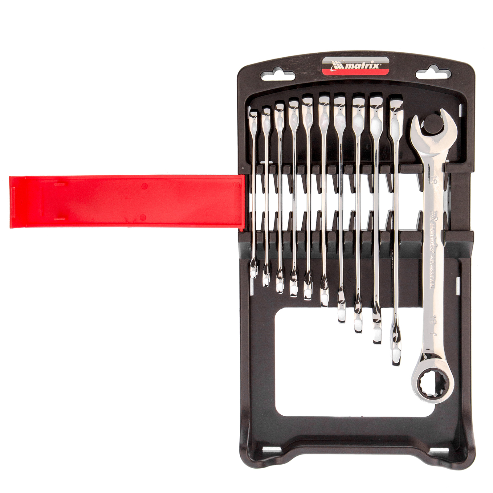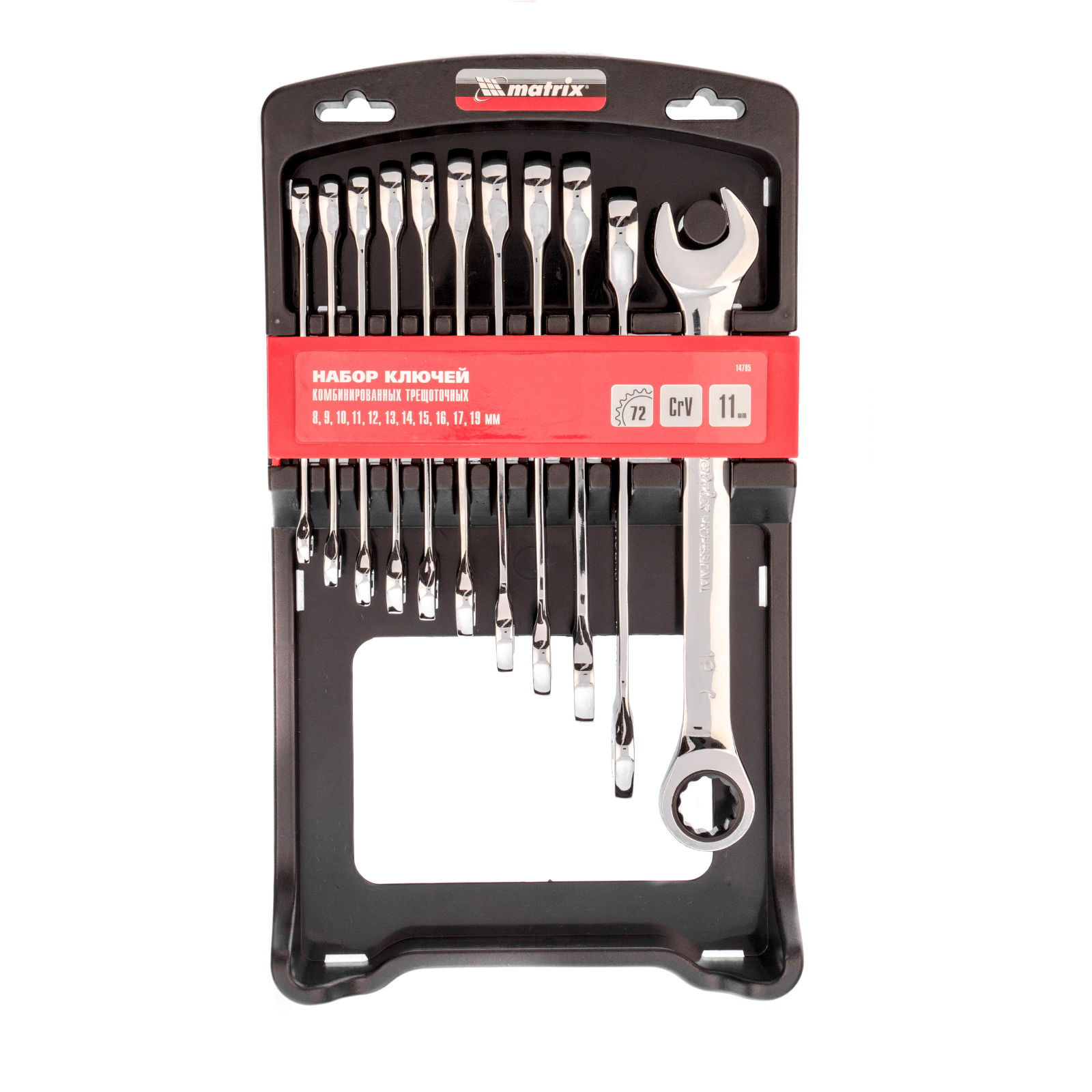 <p>Набор из 11 комбинированных трещоточных ключей Matrix 14795 пригодится мастерам и автолюбителям для монтажа/демонтажа болтов и гаек наиболее популярных типоразмеров. Храповой механизм с 72 зубьями облегчает закручивание или откручивание крепежей, в том числе в труднодоступных местах.</p><h2>Преимущества</h2><ul><li>Надежность — ключи выполнены из хромованадиевой стали повышенной прочности, твердость храпового механизма составляет 58 HRC.</li><li>Защита от разрушения — хромоникелевое антикоррозионное покрытие предохраняет инструменты от воздействия влаги.</li><li>Эффективная работа — 12-гранный профиль накидной части ключа плотно охватывает поверхность крепежа, предотвращая деформацию его граней.</li><li>Удобство хранения и транспортировки — набор упакован в пластиковый держатель.</li></ul>