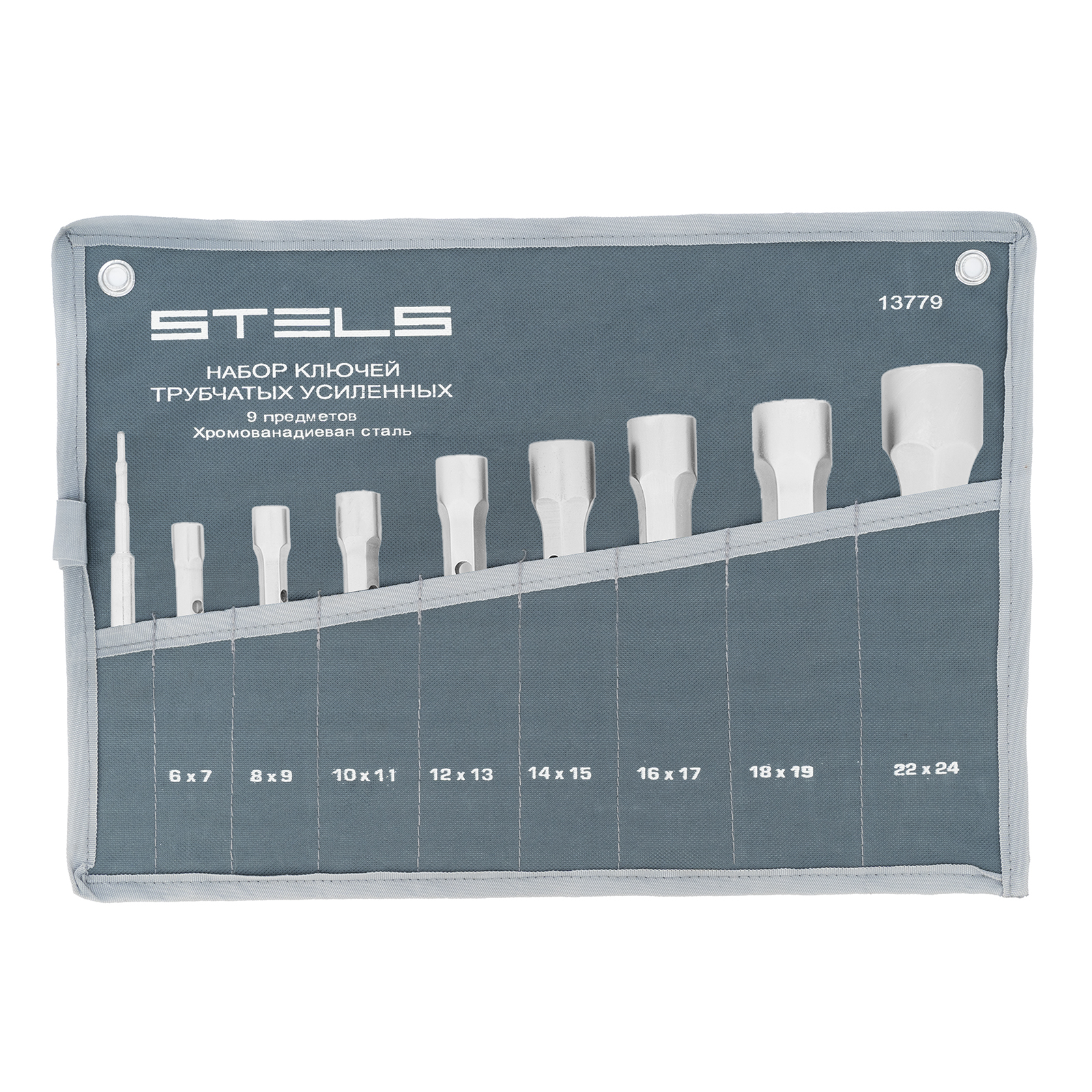 <p>Набор Stels 13779 включает 9 предметов из стали CrV: 8 торцевых усиленных ключей-трубок и поворотный стержень. Ключи с двусторонним профилем основных размеров 6-24 мм рассчитаны на профессиональное применение. Подходят для монтажа/демонтажа болтовых соединений, шпилек и другого крепежа, требующего приложения значительных усилий. Продуманная форма ключей позволяет работать в труднодоступных местах.</p><h2>Преимущества</h2><ul><li>Ключи из прочной хромованадиевой стали устойчивы к механическим нагрузкам.</li><li>Защитное матовое покрытие предотвращает образование коррозии.</li><li>Благодаря усиленной конструкции ключи выдерживают интенсивное применение.</li><li>Набор упакован в сумку-чехол, удобную для хранения и транспортировки.</li></ul>