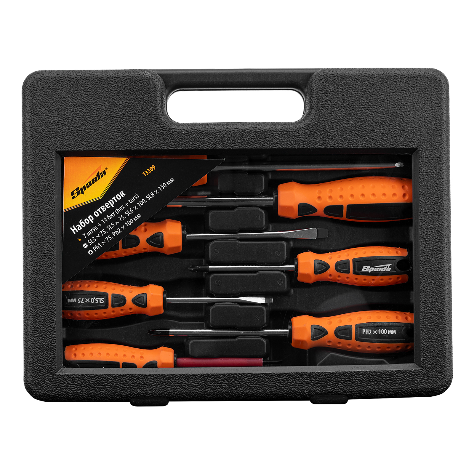 <p>Набор Sparta 13309 включает в себя 21 предмет: отвертки с двухкомпонентными рукоятками и биты длиной 25 мм. Станет недорогим и практичным решением при проведении бытовых ремонтных и монтажных работ. Комплект включает в себя отвертки с крестовым и минусовым шлицем для монтажа/демонтажа крепежных элементов типа PH и SL соответственно. А отвертка-держатель и сменные биты позволяют работать с винтами типа HEX и TORX.</p><h2>Преимущества</h2><ul><li>Отвертки выполнены из углеродистой стали, обладают необходимой прочностью и износостойкостью.</li><li>За счет двухкомпонентных рукояток отвертки не проскальзывают в руке, поэтому с ними комфортно работать.</li><li>Набор поставляется в кейсе для удобства хранения и транспортировки.</li><li>Каждую отвертку можно подвешивать благодаря предусмотренному отверстию в рукоятке.</li></ul>