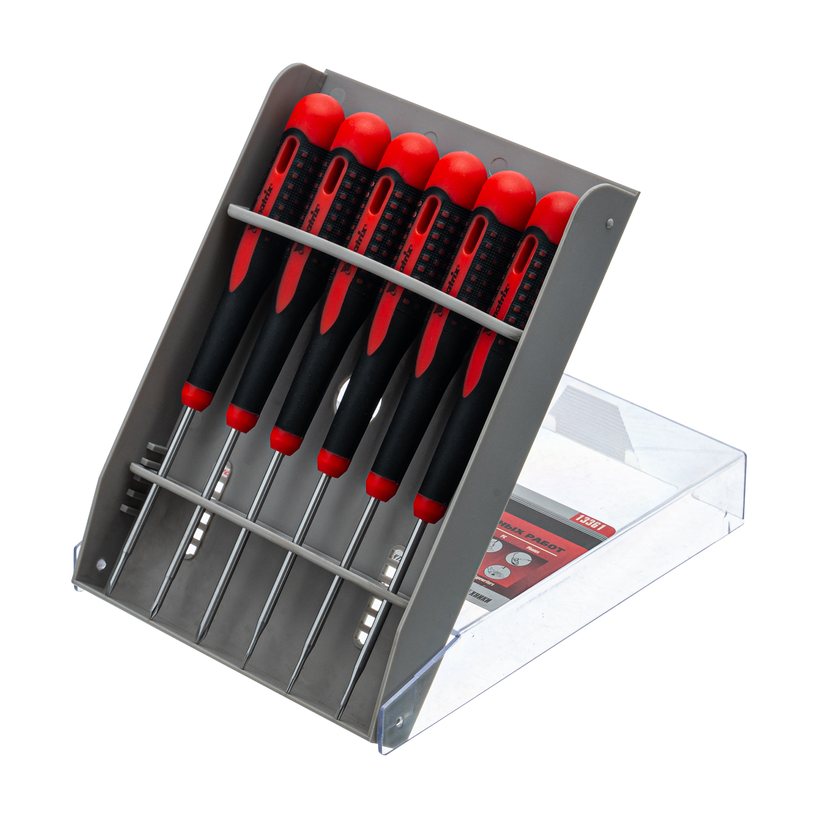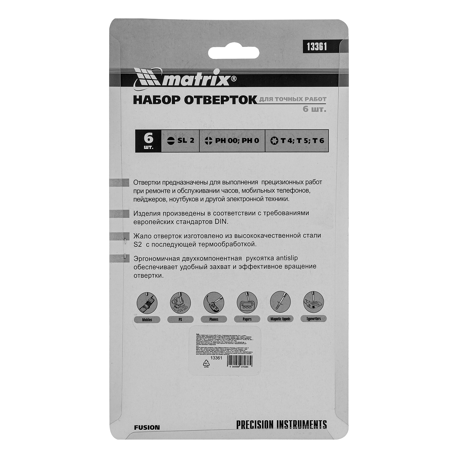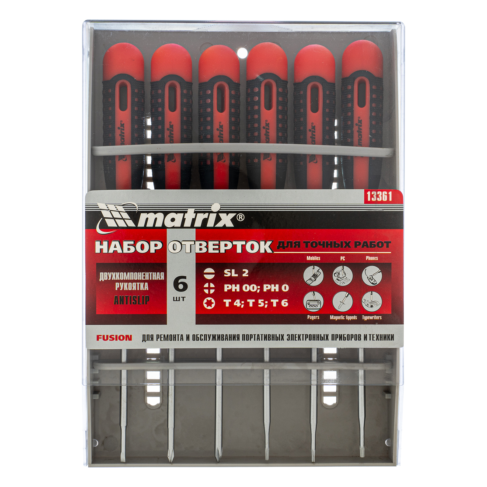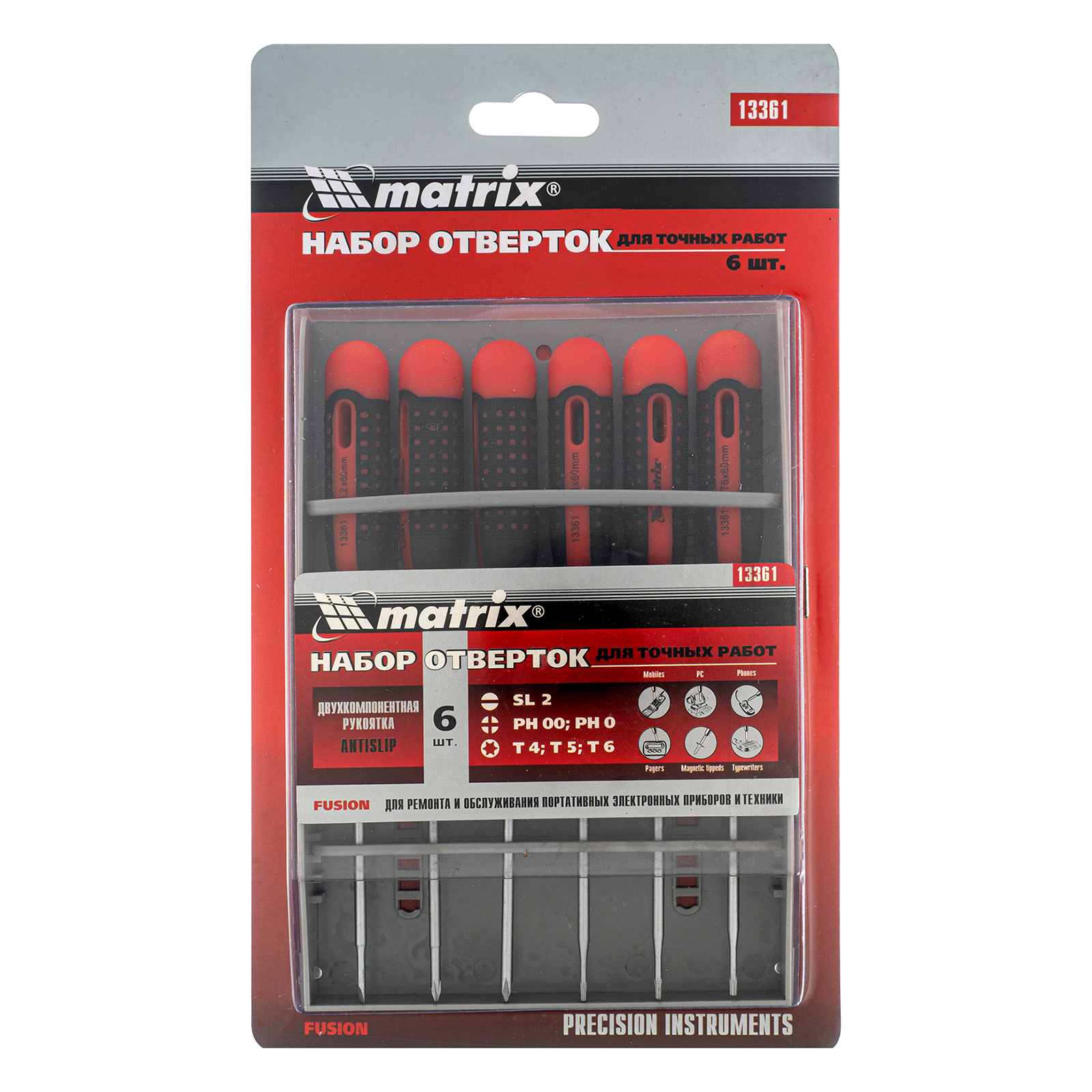 <p>Набор отверток для точных работ Matrix Fusion 13361 c двухкомпонентными рукоятками состоит из 6 инструментов, упакованных в пластиковый пенал, и предназначен для проведения обслуживания и ремонта портативной техники. Отвертки подходят для крепежных элементов со шлицами PH, SL и Torx. Набор пригодится как профессионалам, так и домашним умельцам.</p><h2>Преимущества</h2><ul><li>Прочность и износостойкость — стержни изготовлены из высококачественной легированной японской стали S2 и прошли термообработку.</li><li>Эргономичность — двухкомпонентные рукоятки с антискользящим покрытием обеспечивают надежный хват и необходимую точность движений.</li><li>Продуманная упаковка — набор поставляется в прочном пластиковом пенале.</li><li>Возможность подвесного хранения — в рукоятках имеются отверстия.</li></ul>