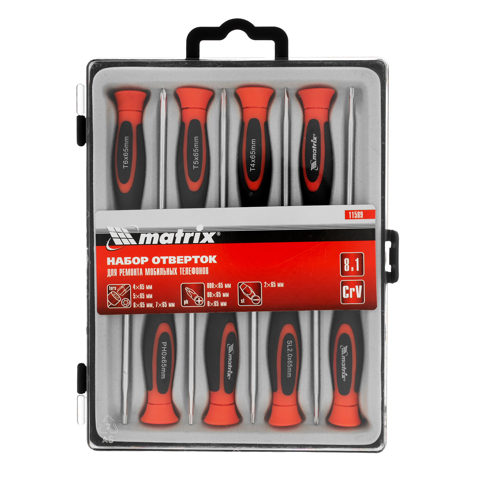 <p>Набор отверток Matrix 11589 включает в себя 8 специализированных инструментов из стали CrV, предназначенных для точных работ с мобильными телефонами. Состоит из отверток под шлицы PH, SL и Torx. У каждой отвертки с тыльной стороны имеется вращающийся затыльник с площадкой под палец, упрощающий вращение инструмента. Набор пригодится мастерам по ремонту портативной электроники.</p><h2>Преимущества</h2><ul><li>Отвертки рассчитаны на длительное использование, т.к. их стержни изготовлены из стали хромованадиевой группы, устойчивой к механическим нагрузкам.</li><li>Эргономичные двухкомпонентные рукоятки удобно лежат в руке, поэтому отвертками удобно работать.</li><li>Инструменты поставляются в пластиковом кейсе с защелкой, благодаря которому их удобно хранить и перевозить.</li></ul>