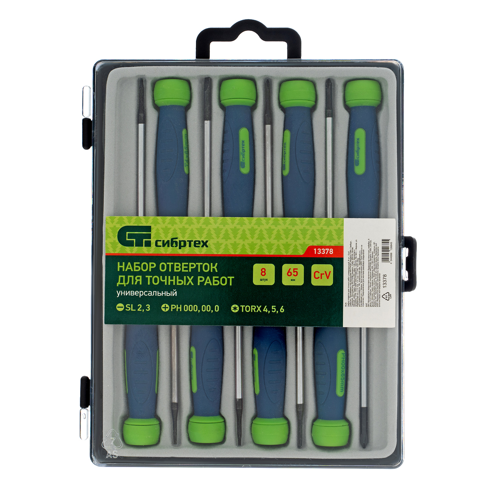 <p>Универсальный набор отверток Сибртех 13378 включает 8 инструментов из стали CrV и рассчитан на полупрофессиональное использование при проведении точных работ. Отвертками можно закручивать и откручивать микровинты типа SL, PH и TORX, поэтому они пригодятся для ремонта мелкой бытовой техники, электроники, детских игрушек и других устройств.</p><h2>Преимущества</h2><ul><li>Высокое качество исполнения — стержни отверток изготовлены из прочной хромованадиевой стали.</li><li>Удобная работа — поворотные затыльники позволяют быстро вращать отвертки перебором пальцев.</li><li>Эргономичность — двухкомпонентные рукоятки удобно лежат в руке.</li><li>Продуманное хранение и транспортировка — набор упакован в пластиковый бокс с подвесом.</li></ul>