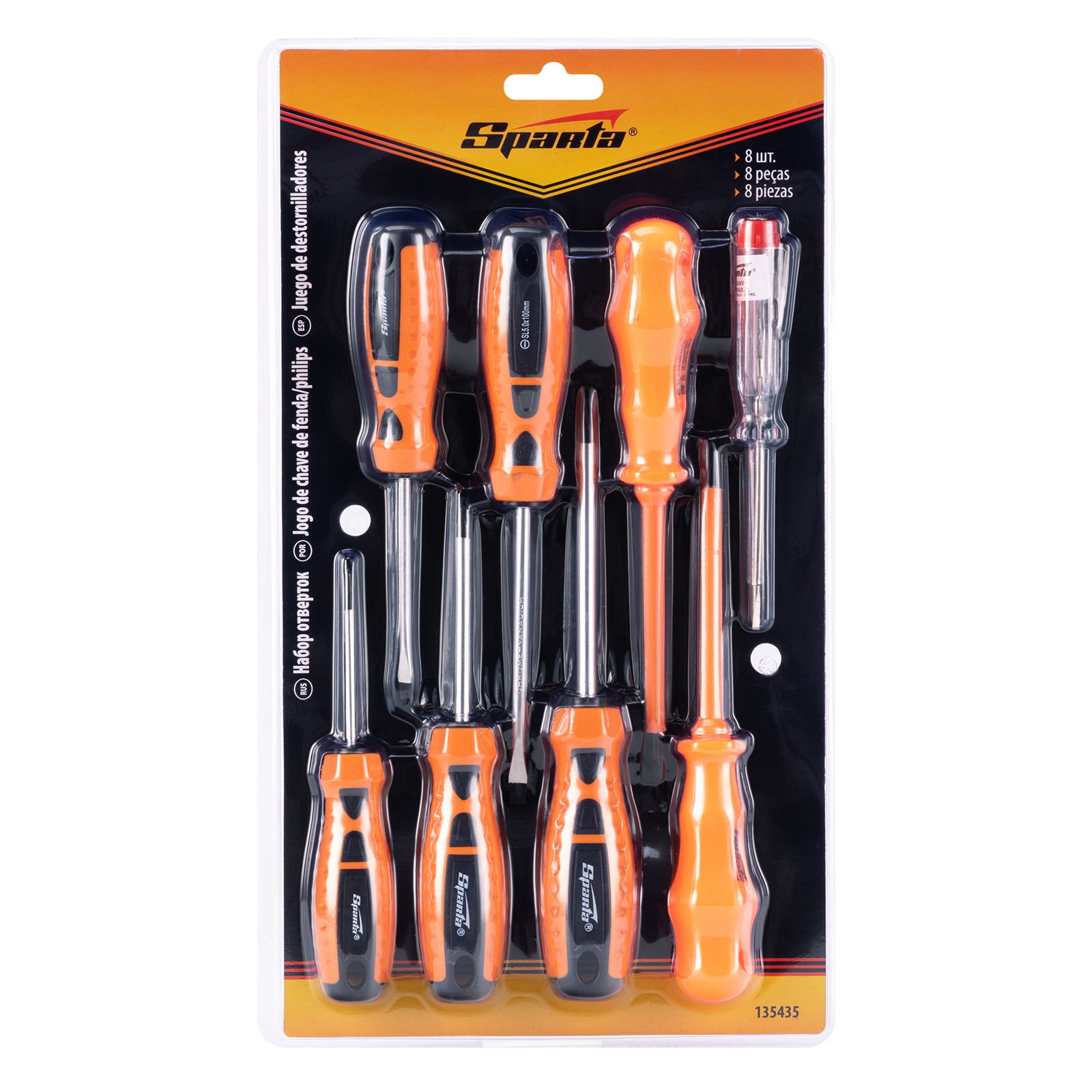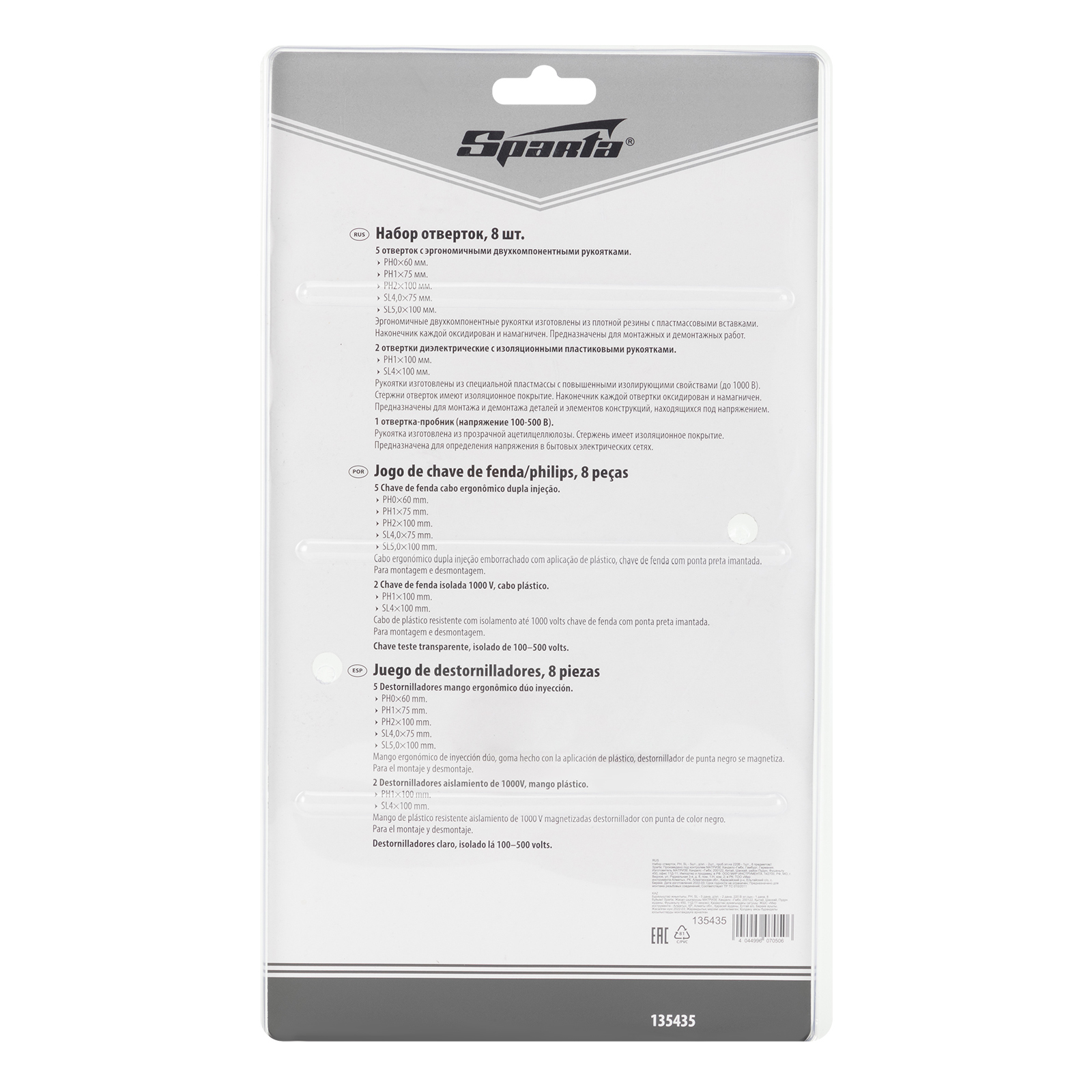 <p>Набор отверток Sparta 135435 включает 8 предметов: 5 отверток для монтажа/демонтажа крепежных элементов с профилем PH и SL, 2 диэлектрические отвертки и электрический пробник на 220 В. Он пригодится для ремонта и обслуживания электрооборудования в быту. Важно — техника безопасности исключает проведение работ под напряжением!</p><h2>Преимущества</h2><ul><li>Оптимальная прочность — стержни отверток выполнены из стали 45.</li><li>Безопасная работа — входящий в комплект тестер позволяет отслеживать наличие напряжения в сети.</li><li>Комфортная работа — эргономичные рукоятки с антискользящим покрытием обеспечивают надежный хват.</li><li>Удобное хранение — благодаря отверстиям в рукоятках отвертки можно подвешивать на крючки или гвозди.</li></ul>