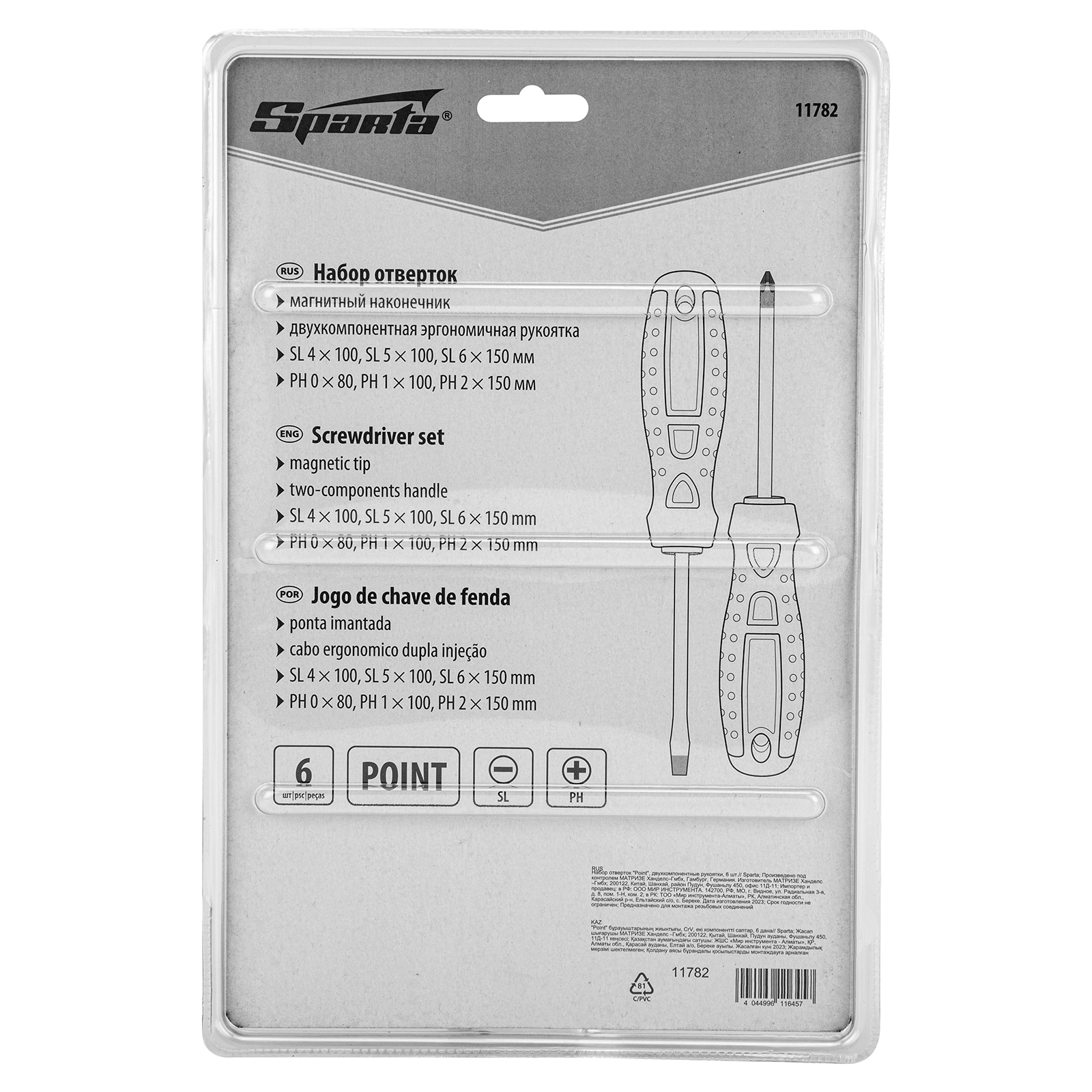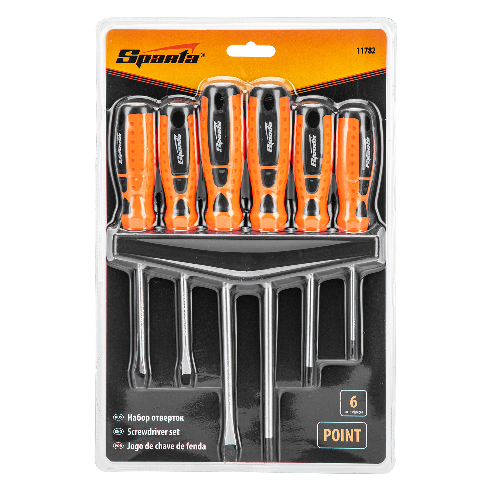 <p>Набор отверток Sparta «Point» 11782 с двухкомпонентными рукоятками, CrV, состоит из 6 инструментов наиболее распространенных типоразмеров. Применяется для закручивания и откручивания крепежных элементов с профилем SL и PH. Набор рассчитан на бытовое использование, осуществление несложных монтажных и ремонтных работ. Отвертками можно работать в труднодоступных местах, т.к. комплект включает инструменты как с коротким — 75 мм, так и с длинным стержнем 150 мм.</p><h2>Преимущества</h2><ul><li>Комплектующие набора выполнены из хромованадиевой стали, которая является залогом их прочности.</li><li>Двухкомпонентные рукоятки обеспечивают комфортную работу даже при большом объеме задач.</li><li>Подвесная полка обеспечивает удобное хранение отверток, также на рукоятке каждого инструмента предусмотрено отверстие для подвесного хранения.</li></ul>