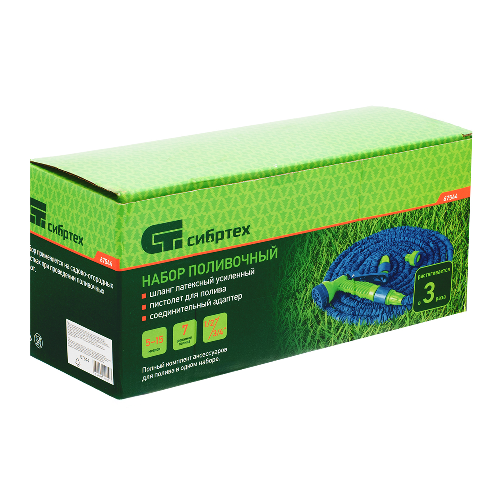 <p>Поливочный набор Сибртех 67544 состоит из растягивающегося шланга длиной 15 м, 7-режимного пистолета, соединителя, адаптера, и представляет собой готовую систему орошения. Благодаря переходнику шланг можно подключить к крану или отводу диаметром 1/2" или 3/4". Набор пригодится владельцам дачных участков, также может использоваться для ухода за растениями в скверах или парках.</p><h2>Преимущества</h2><ul><li>Простая эксплуатация — под давлением воды шланг из однослойного латекса растягивается до 15 м.</li><li>Долговечность — пистолет изготовлен из прочного ABS-пластика.</li><li>7 режимов орошения — пистолет-распылитель имеет регулируемое сопло.</li><li>Удобное хранение и транспортировка — длина шланга в сжатом состоянии составляет 5 м, общий вес всех элементов 0,6 кг.</li></ul>