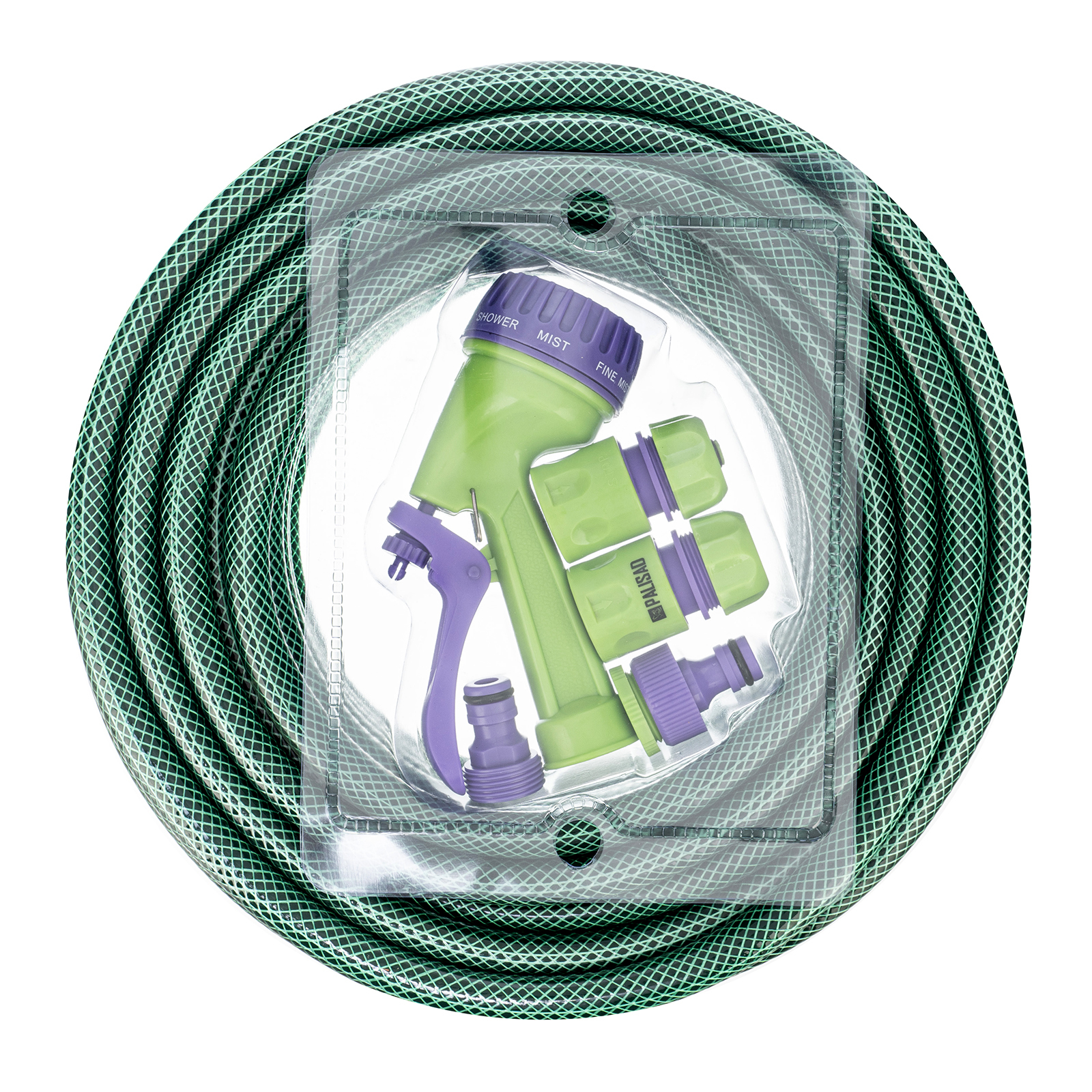 - Прочность и долговечность — шланг изготовлен из высококачественного ПВХ, устойчивого к ультрафиолету, дополнительные элементы набора выполнены из ABS-пластика и не боятся коррозии.