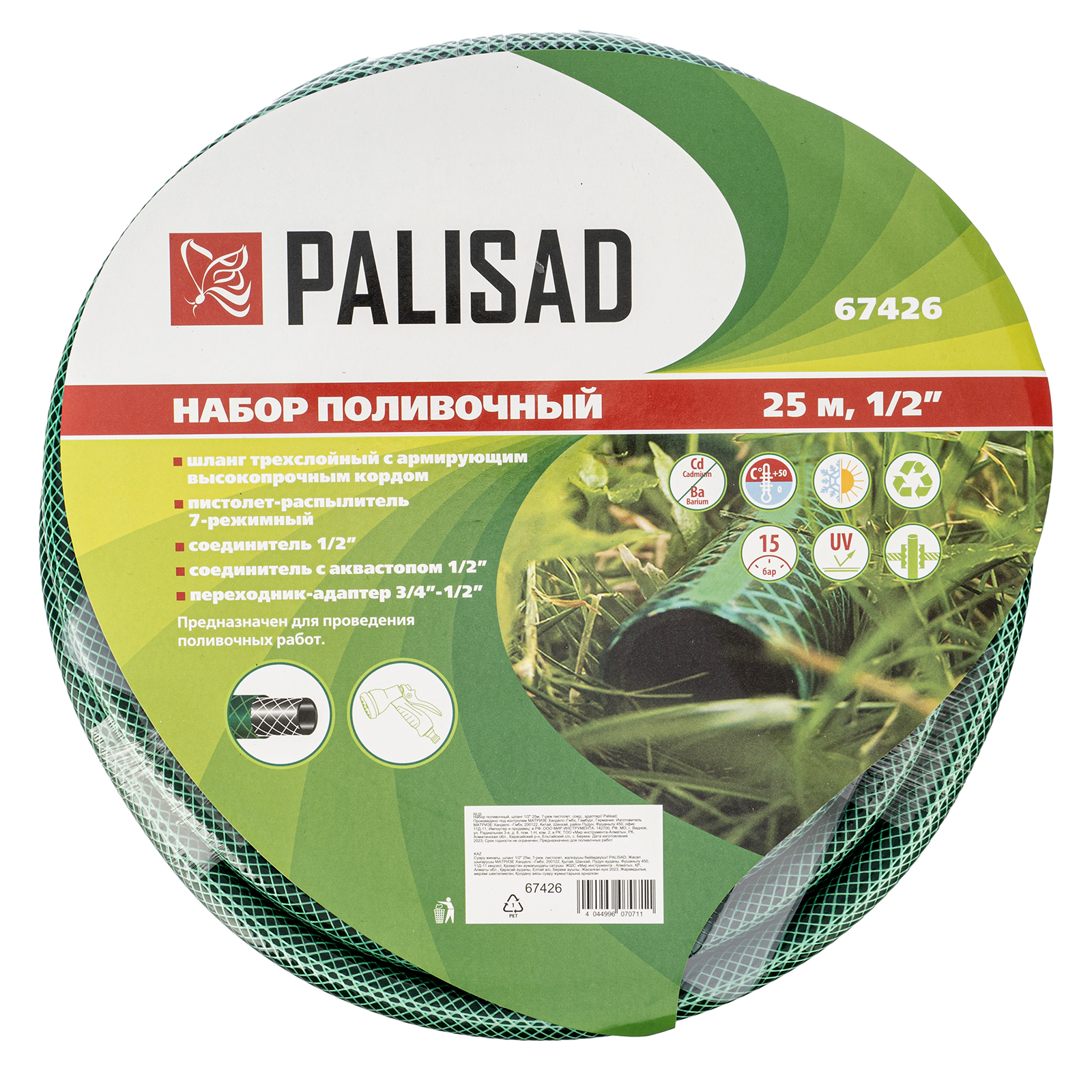 Набор поливочный, шланг 1/2", 25 м, 7 режимов пистолет, соединитель, адаптер Palisad