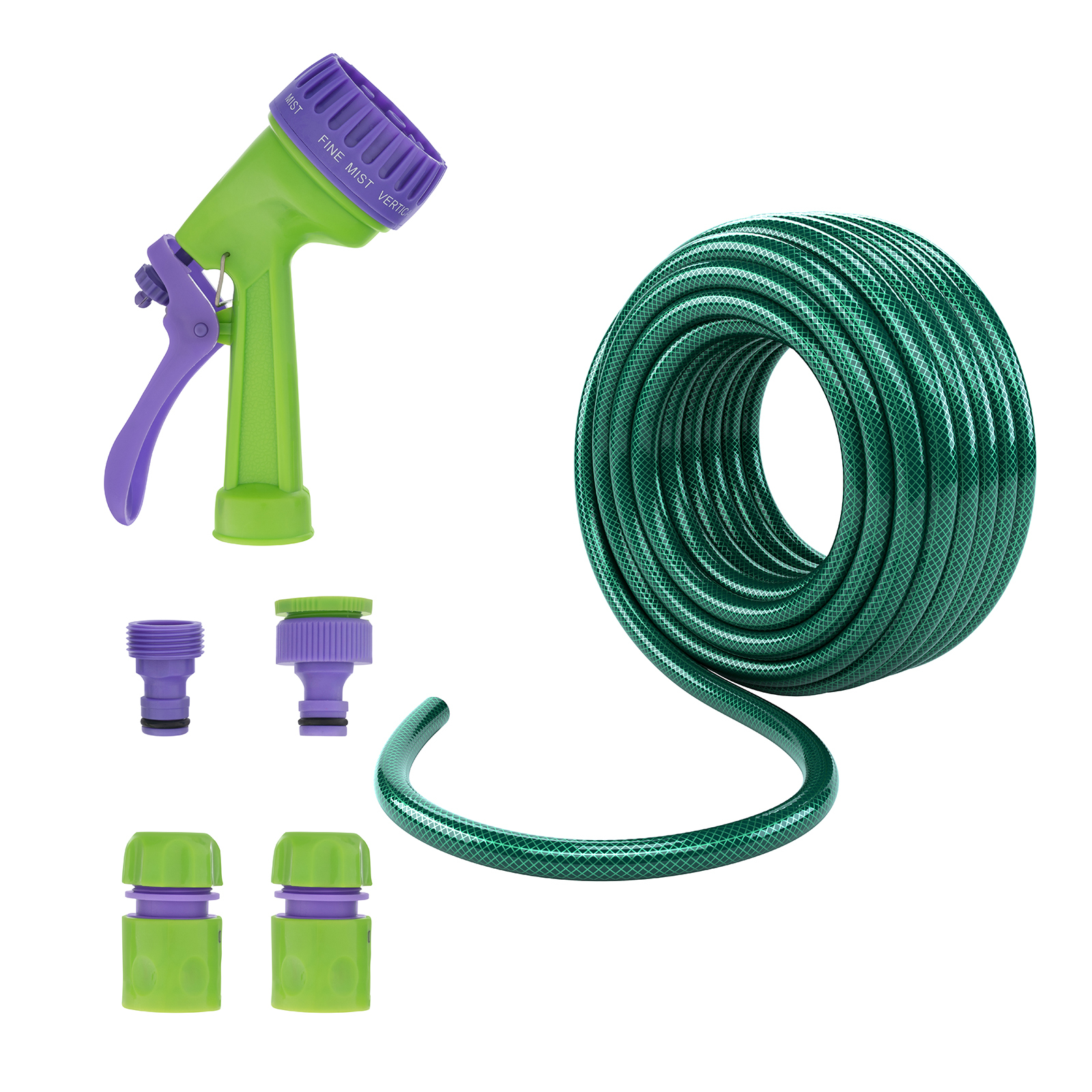 - Прочность и долговечность — шланг изготовлен из высококачественного ПВХ, устойчивого к ультрафиолету, дополнительные элементы набора выполнены из ABS-пластика и не боятся коррозии.