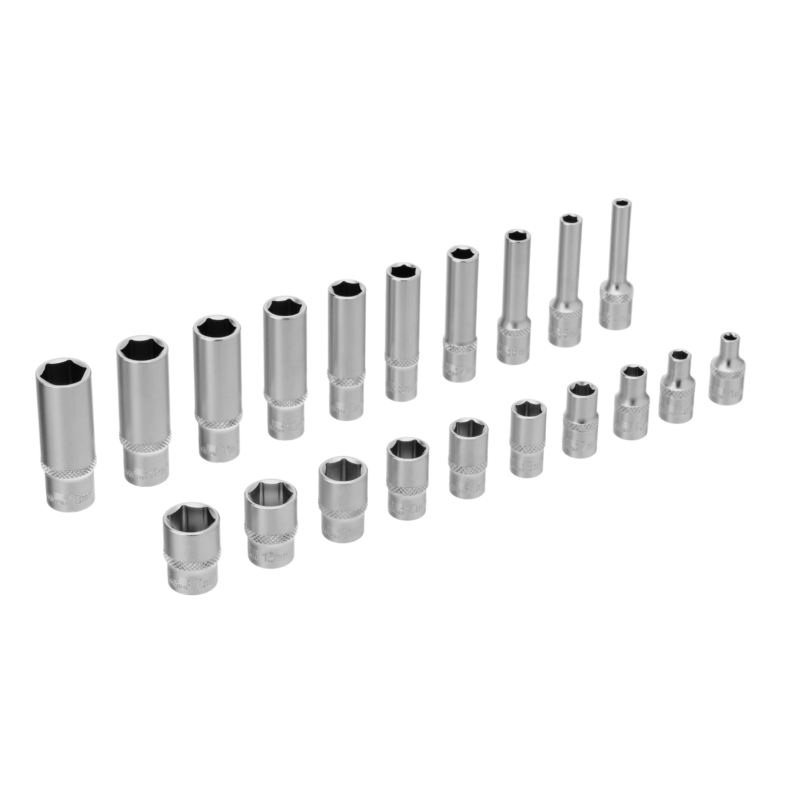 Ключ трещоточный - 1 штКардан - 1 штУдлинители 50, 100 - 2 штАдаптеры - 2 штГоловки 4, 5, 6, 7, 8, 9, 10, 11, 12, 13 - 10 штГоловки удлиненные 4, 5, 6, 7, 8, 9, 10, 11, 12, 13 - 10 штКейс - 1 шт