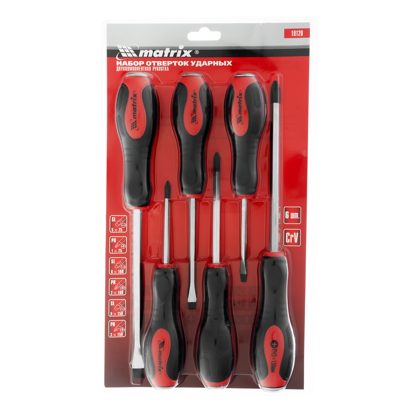 <p>Набор Matrix 19120 из стали CrV состоит из 6 ударных отверток типоразмеров PH1x75, PH2x100, PH3x150, SL5x75, SL6x100, SL8x150. Предназначен для работы с резьбовым крепежом, в том числе для демонтажа перетянутых или заржавевших соединений. У каждой отвертки имеется металлический затыльник, выдерживающий удары молотком или киянкой. Набор рекомендован для профессионального использования и будет полезен во время ремонта оборудования или автотехники.</p><h2>Преимущества</h2><ul><li>Прочность и износостойкость — стержни изготовлены из высококачественной хромованадиевой стали.</li><li>Повышенная устойчивость к ударным нагрузкам — усиленные стержни шестигранной формы проходят сквозь рукоятки.</li><li>Антикоррозийная защита — наконечники прошли фосфатирование.</li><li>Комфортная работа — двухкомпонентные рукоятки с рельефными зонами не выскальзывают из ладони.</li></ul>