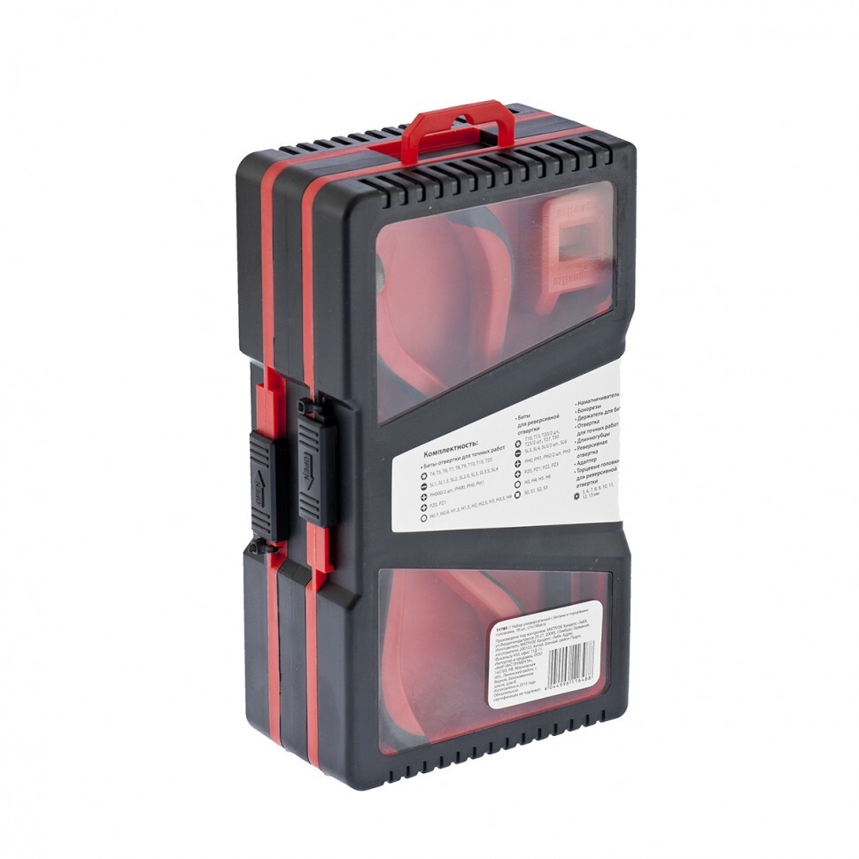 Реверсивная отвертка - 1 штАдаптер - 1 штДержатель для бит - 1 штОтвертка для точных работ - 1 штБокорезы - 1 штДлинногубцы - 1 штНамагничиватель - 1 штОтвертки - 30 штБиты - 28 шт