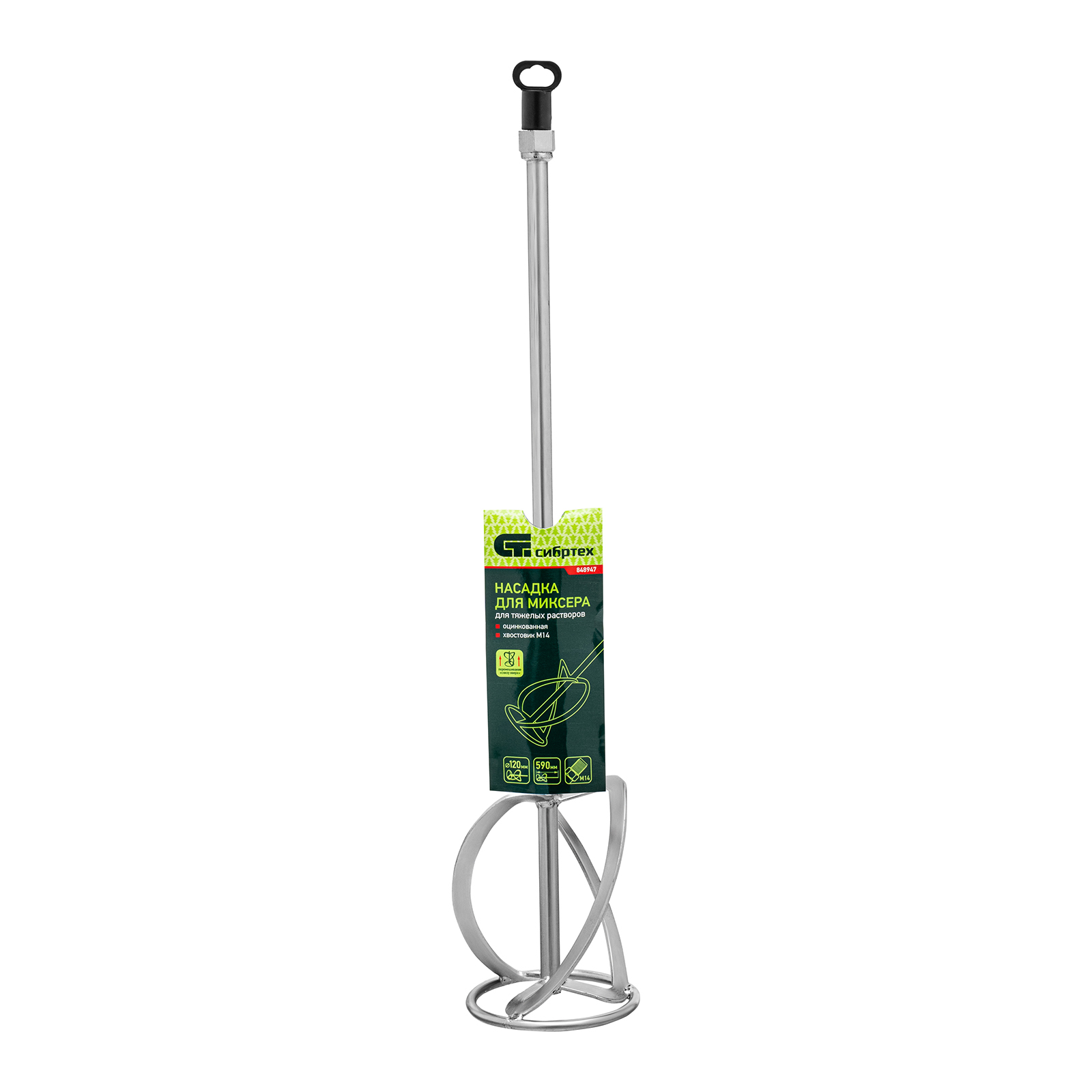 Оцинкованная насадка для миксера Сибртех 848947 размером 120 х 590 мм, с хвостовиком М14, используется для приготовления штукатурных, цементных смесей, шпатлевок и других тяжелых растворов. Перемешивает состав снизу вверх, не давая тяжелым частицам оседать на дне, при этом нагрузка на инструмент минимальна. Насадка устанавливается на профессиональный электроинструмент с соответствующей присоединительной резьбой и используется на строительной площадке.