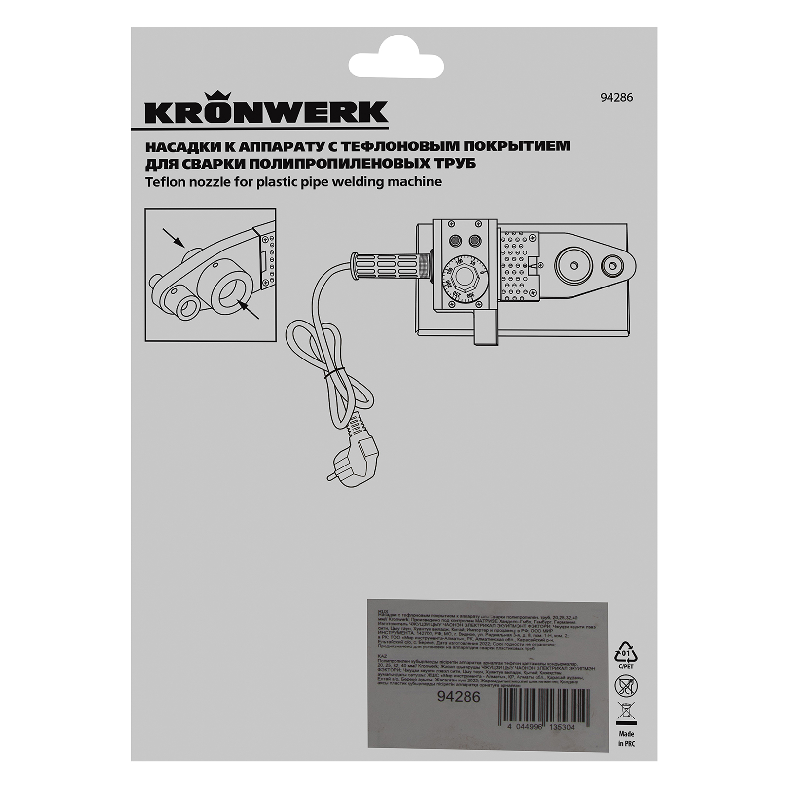 Насадки с тефлоновым покрытием Kronwerk 94286 диаметром 20, 25, 32 и 40 мм подходят к любому аппарату для сварки полипропиленовых труб. Каждая насадка состоит из 2 частей: одна для трубы и одна для фитинга. Набор пригодится для монтажа и ремонта систем водопровода.