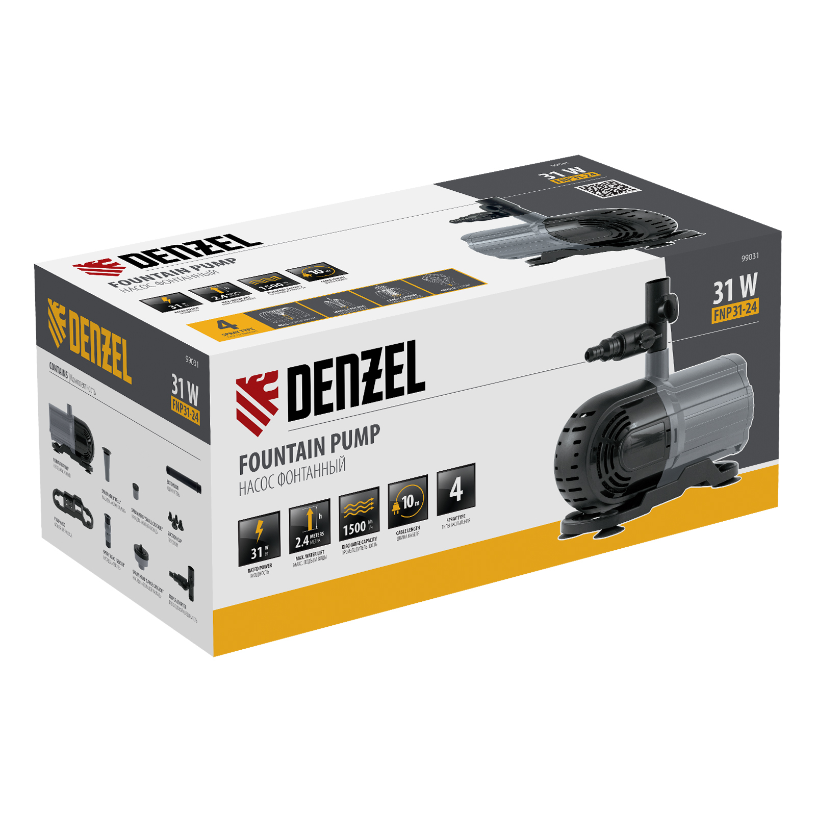 Насос фонтанный FNP31-24, 31 Вт, подъем 2,4 м, 1500 л/ч, колокольчик/2 каскада/гейзер Denzel