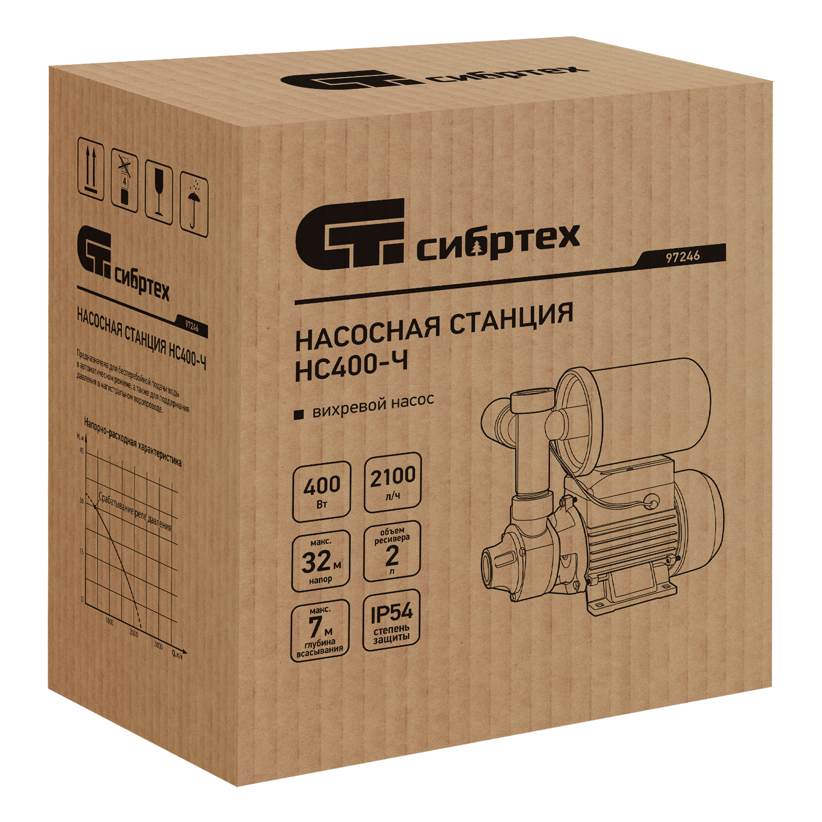 Насосная станция Сибртех НС400-Ч 97246 мощностью 400 Вт, с ресивером на 2 л, обеспечивает напор до 32 м и производительность до 2100 л/ч. Предназначена для бесперебойной подачи чистой воды с глубины до 7 м, позволяет организовать водоснабжение на дачном участке. Насосная станция поддерживает стабильное давление в напорной магистрали и оптимальна для создания системы полива.