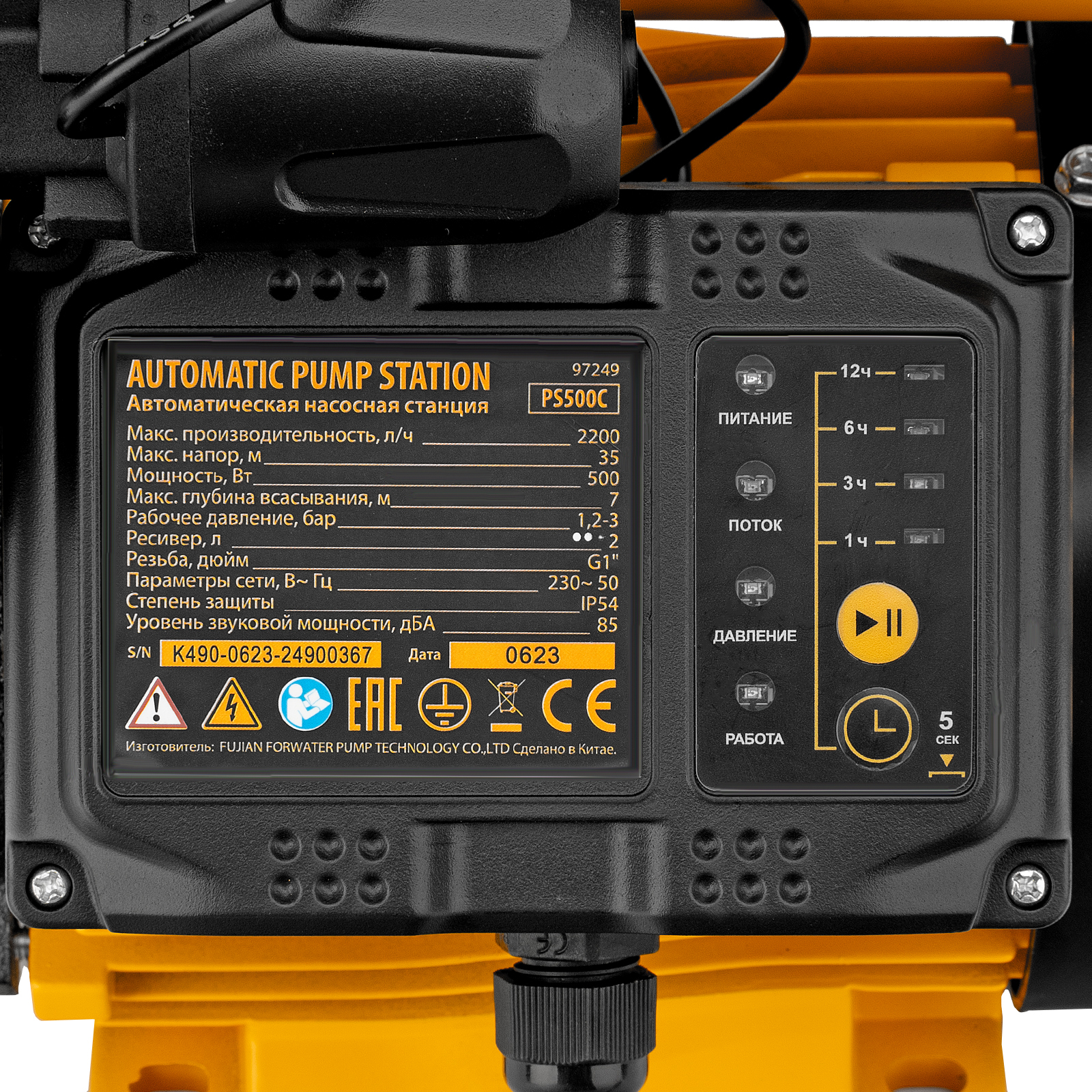 - Плавный пуск — станция запускается через 3 секунды после подключения питания, такое решение позволяет защитить двигатель и снизить нагрузку на электросеть.