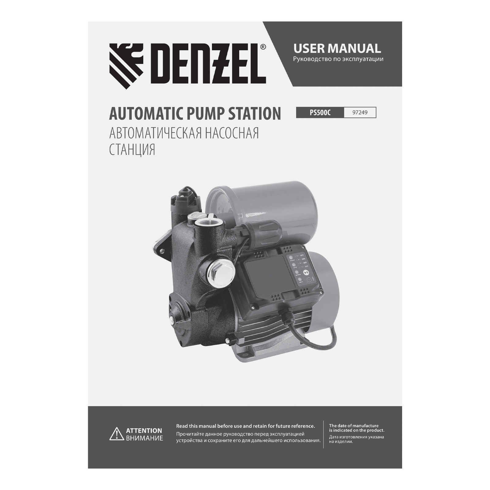 Насосная станция PS500C, 500 Вт, напор 35 м, 2200 л/ч, ресивер 2 л, блок управления Denzel