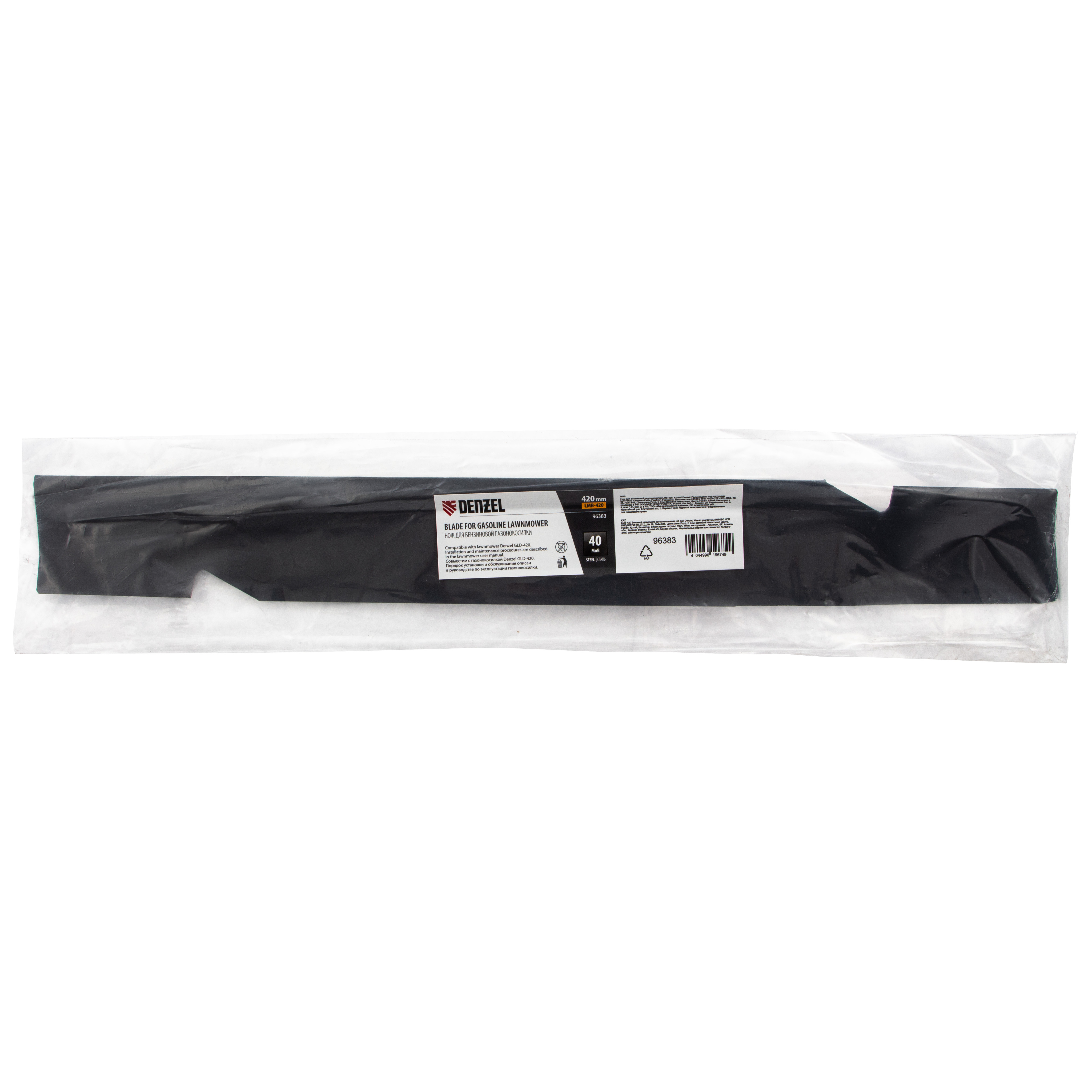 <p>Нож Denzel 96383 длиной 42 см — сменный режущий элемент для бензиновой газонокосилки GLD-420. Используется для скашивания травы на дачных газонах, кортах, а также для ухода за садовыми и парковыми территориями. Эффективно срезает траву, особенно удобен для работы на небольших участках, например, ограниченных строениями или деревьями. Нож для газонокосилки пригодится владельцам дачных участков и работникам коммунальных служб.</p><h2>Преимущества</h2><ul><li>Долговечность — нож из прочной стали 40MnB выдерживает динамические нагрузки.</li><li>Устойчивость к износу — режущая кромка ножа закалена до твердости 40-45 HRC.</li><li>Защита от разрушения — на нож нанесено антикоррозийное покрытие.</li></ul>