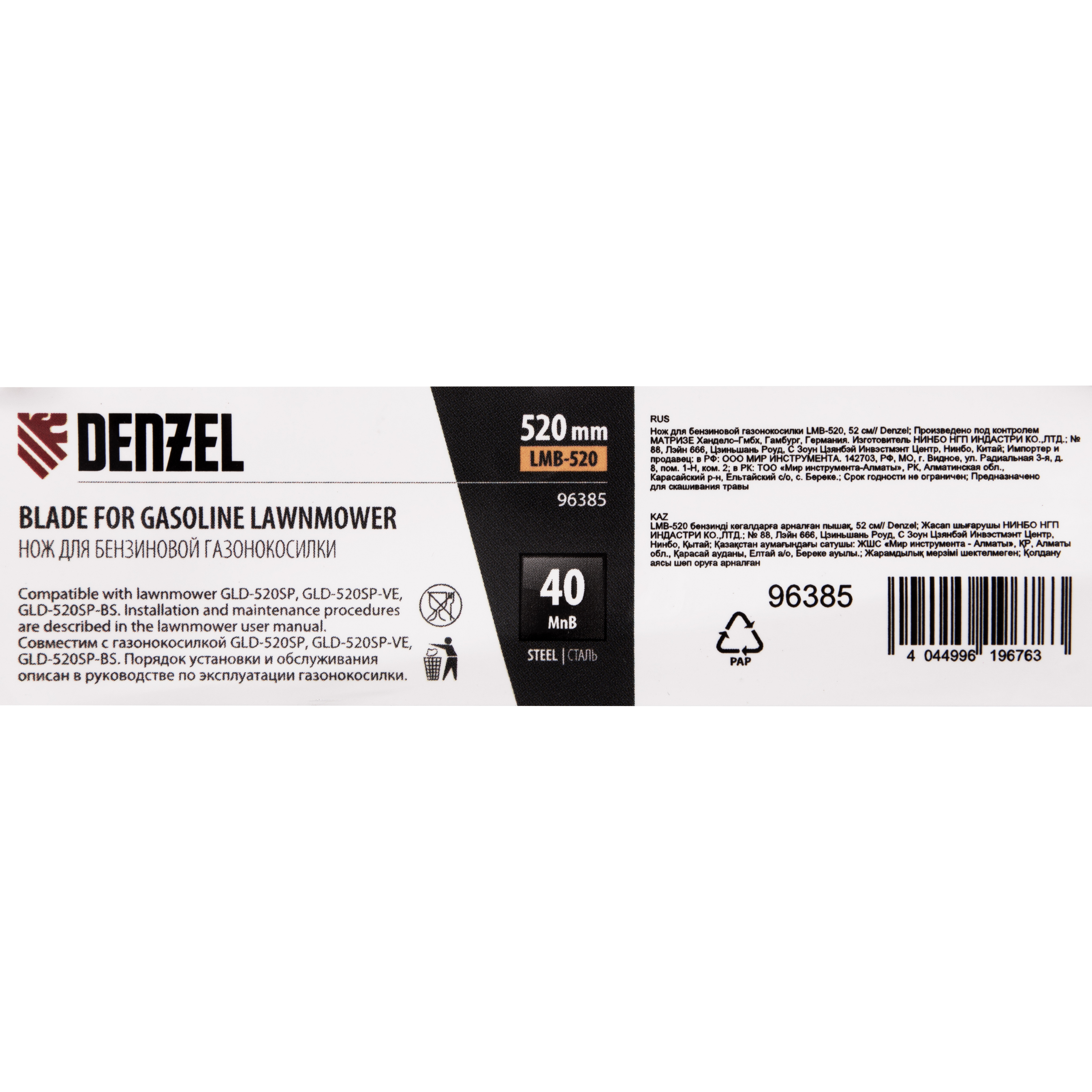 <p>Нож Denzel 96385 длиной 52 см — сменный режущий элемент для бензиновых газонокосилок GLD-520SP, GLD-520SP-BS и GLD-520SP-VE. Используется для скашивания травы на дачных газонах, кортах, а также для ухода за садовыми и парковыми территориями. Эффективно срезает траву, пригодится владельцам дачных участков и работникам коммунальных служб.</p><h2>Преимущества</h2><ul><li>Долговечность — нож из прочной стали 40MnB выдерживает динамические нагрузки.</li><li>Устойчивость к износу — режущая кромка ножа закалена до твердости 40-45 HRC.</li><li>Защита от разрушения — на нож нанесено антикоррозийное покрытие.</li></ul>