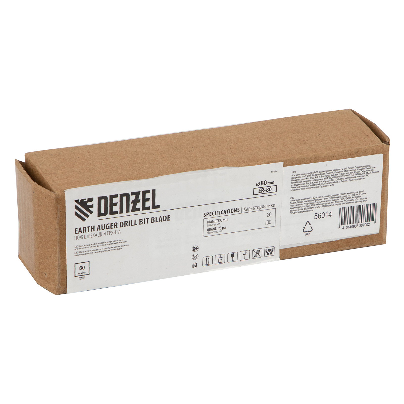 <p>Нож шнека для грунта Denzel ER-80 56014 диаметром 80 мм, 2 шт. в комплекте, используется совместно со шнеком Denzel ER-80, артикул 56005. Шнек с лезвием устанавливается на мотобур для сверления отверстий в грунте. Оптимально подходит для выполнения строительных и ремонтных работ на дачном участке и небольших строительных площадках.</p><h2>Преимущества</h2><ul><li>Качественное исполнение — лезвия из прочной легированной стали 34CR4 долго держат заточку и позволяют справляться даже с замерзшим грунтом.</li><li>Антикоррозионные свойства — защитное покрытие предотвращает преждевременное разрушение ножей.</li><li>Ножи выполнены съемными — это позволяет избежать замены всего шнека при их поломке.</li><li>2 штуки в комплекте — запасное лезвие позволяет быстро заменить затупившуюся или сломанную оснастку, не прекращая рабочий процесс надолго.</li></ul>