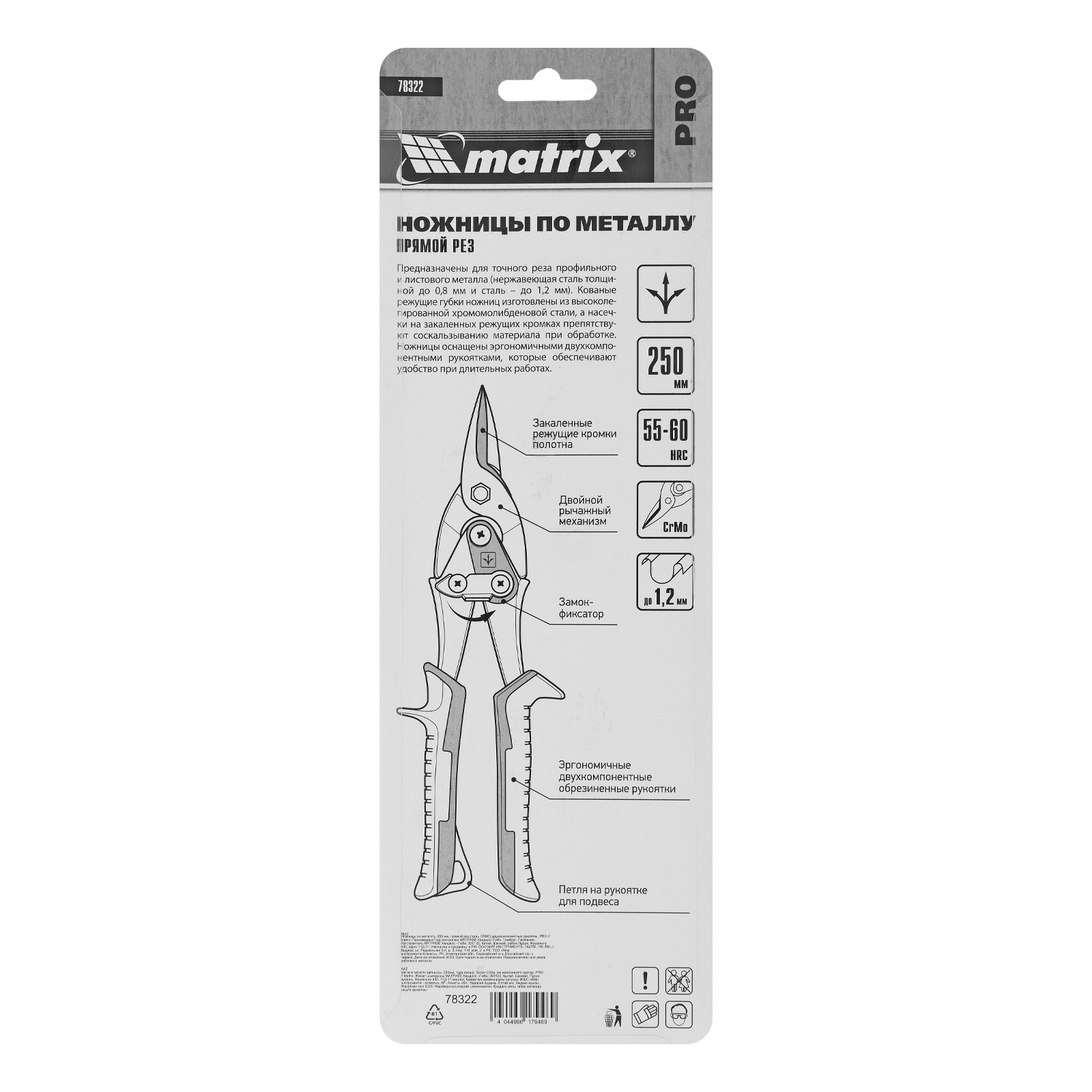 Ножницы по металлу Matrix PRO 78322 длиной 250 мм, из стали CrMo, с двухкомпонентными рукоятками, предназначены для прямого реза листовых и профильных металлических заготовок, в том числе стали толщиной до 1,2 мм и нержавеющей стали толщиной до 0,8 мм. Двойной рычажный механизм позволяет прикладывать значительное усилие при резке толстого материала. Для удобства работы на корпусе имеется маркировка с указанием направления резания. Ножницы будут полезны в профессиональной и домашней мастерской.