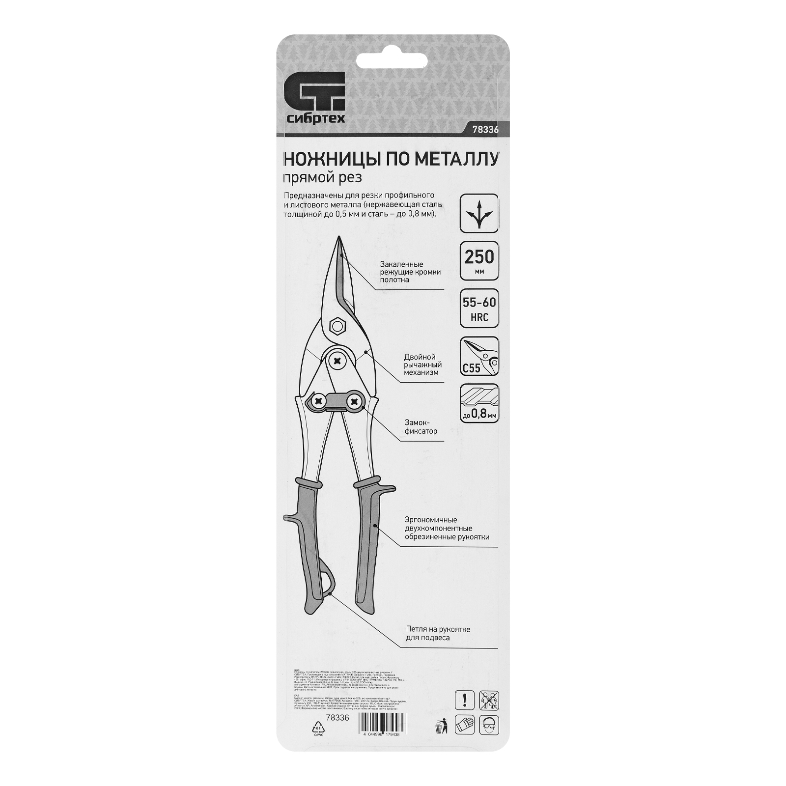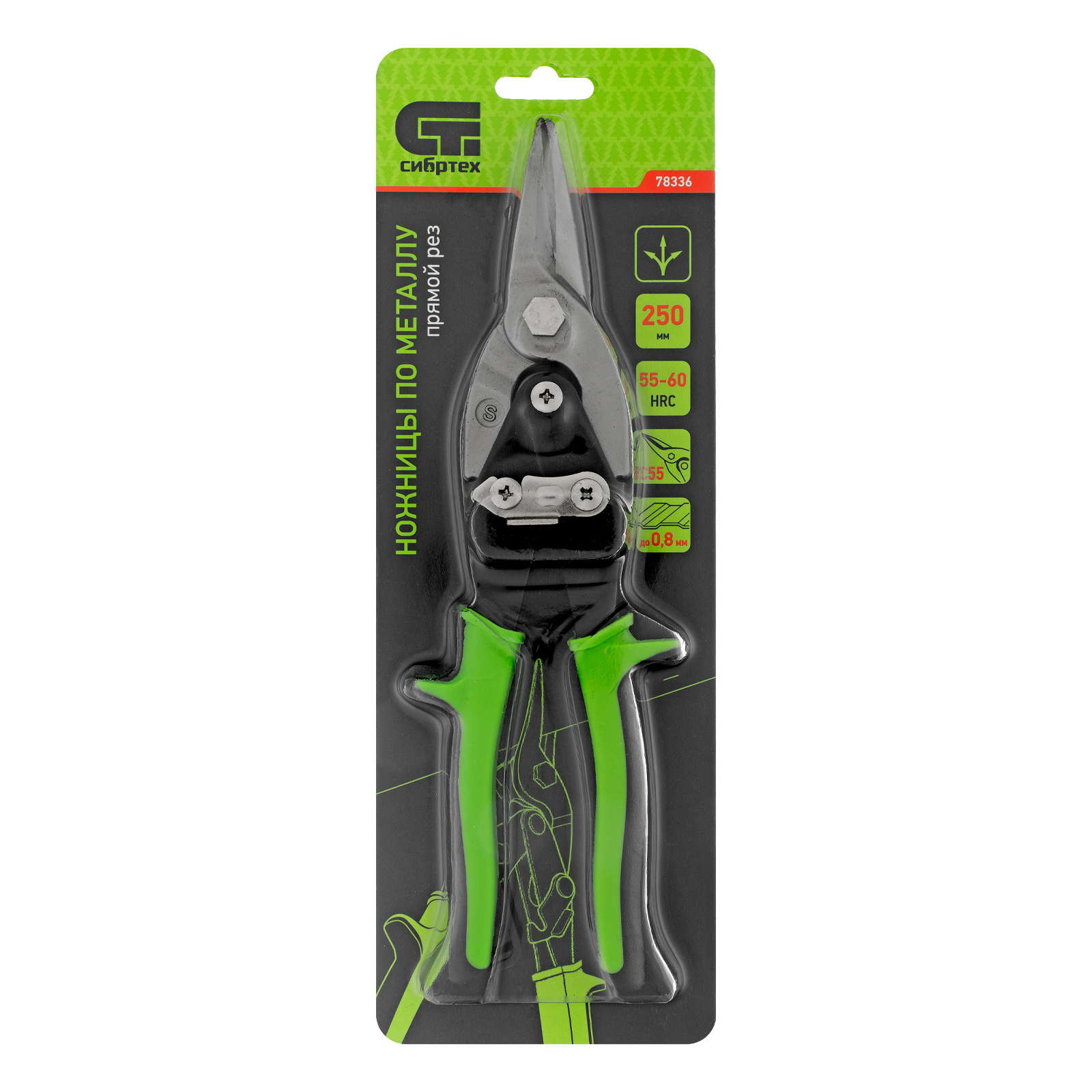 Ножницы Сибртех 78336 длиной 250 мм, из стали С55, с двухкомпонентными рукоятками, используются для прямого реза профильного и листового металла. Предназначены для проведения ремонтных и монтажных работ с материалами толщиной до 0,8 мм.