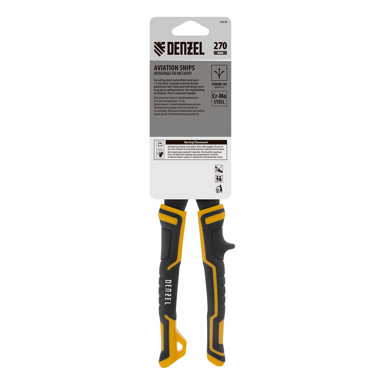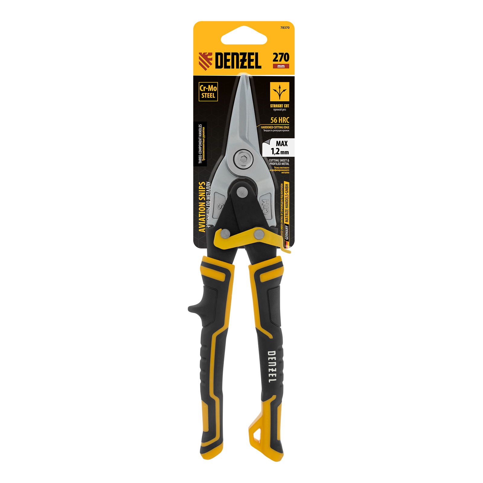 Ножницы по металлу Denzel 78370 общей длиной 270 мм, из стали-CrMo, с трехкомпонентными рукоятками, предназначены для прямого реза листовых металлических заготовок и металлопрофиля толщиной до 1,2 мм. Инструмент с усиленной конструкцией осевого шарнира рассчитан на профессиональное использование. Ножницы используются для проведения строительных, кровельных и слесарных работ.