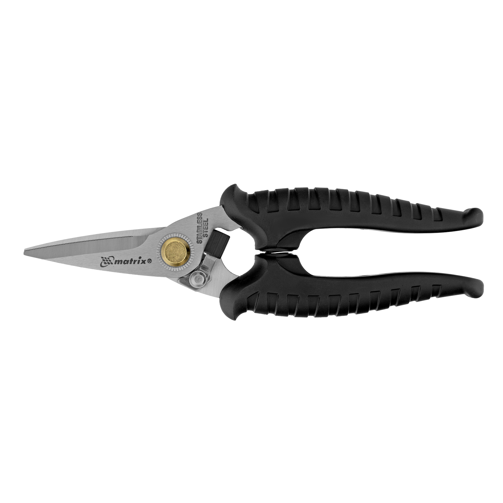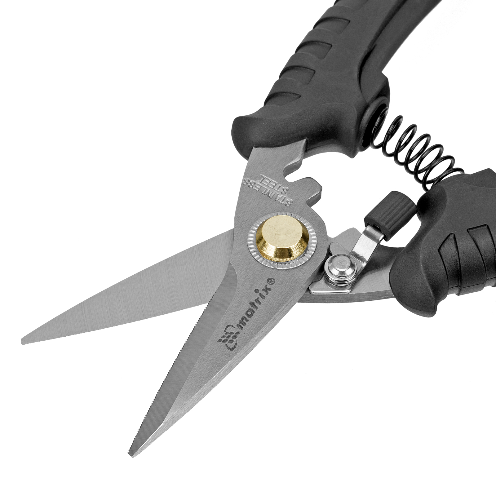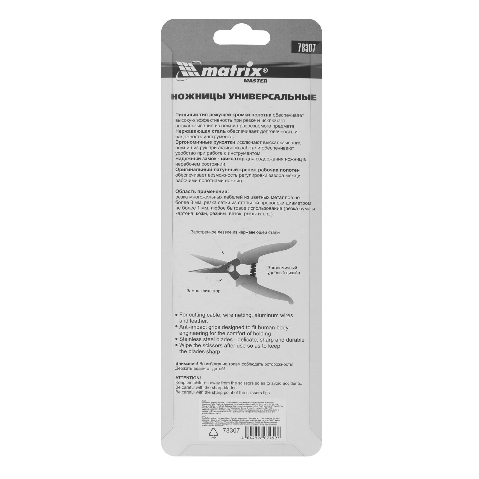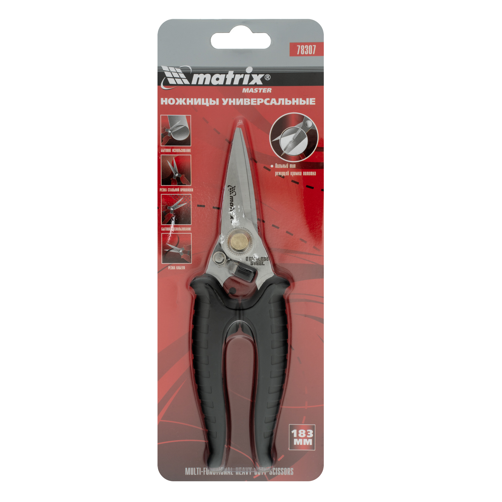 Универсальные ножницы Matrix 78307 длиной 183 мм — инструмент для разрезания тонкого металла и мягких материалов. Лезвия ножниц зазубрены, поэтому разрезаемый материал не выскальзывает из них. Инструмент подходит для выполнения разнообразных бытовых работ. На даче он поможет разрезать стальную сетку толщиной до 1 мм, во время мелкого ремонта или занятий творчеством — провода, кожу, резину, картон, бумажную лозу и другие материалы, в походе — срезать ветки или разделать рыбу.