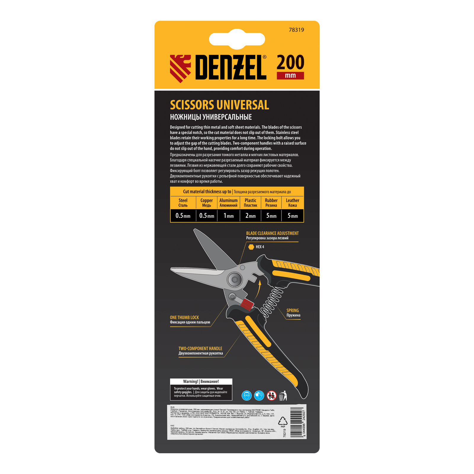 Универсальные ножницы Denzel 78319 длиной 200 мм — инструмент для разрезания тонкого металла и мягких материалов. Одно из лезвий имеет серрейторную (зубчатую) заточку, поэтому разрезаемый материал не выскальзывает из инструмента. Ножницы подходят для выполнения разнообразных работ: на даче помогут разрезать стальную сетку с небольшим диаметром проволоки, в походе — ветки или рыбу, во время мелкого ремонта или занятий творчеством — провода, кожу, резину, картон, бумажную лозу и другие материалы.